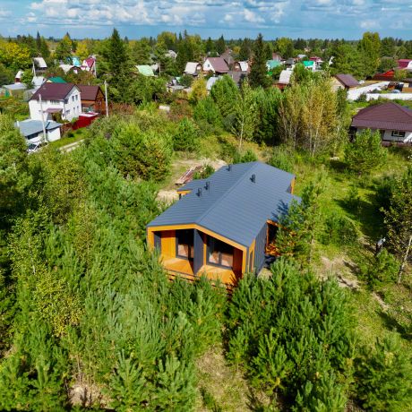 Каркасный дом по нашему типовому проекту находящийся в СНТ "Хуторок". Фундамент винтовые сваи. Толщина теплоизоляции стен 150 мм , кровли 200 мм , фасад комбинированный из профнастила и дерева, кровля профнастил.
