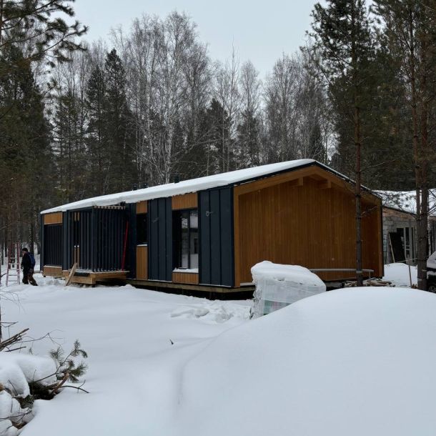 Каркасная дом-баня по нашему типовому проекту находящийся в п. Кирово. Фундамент винтовые сваи. Толщина теплоизоляции стен 150 мм , кровли 200 мм , фасад комбинированный из кликфальца и дерева, кровля фальцевая, внутренняя отделка ГКЛ/вагонка штиль.