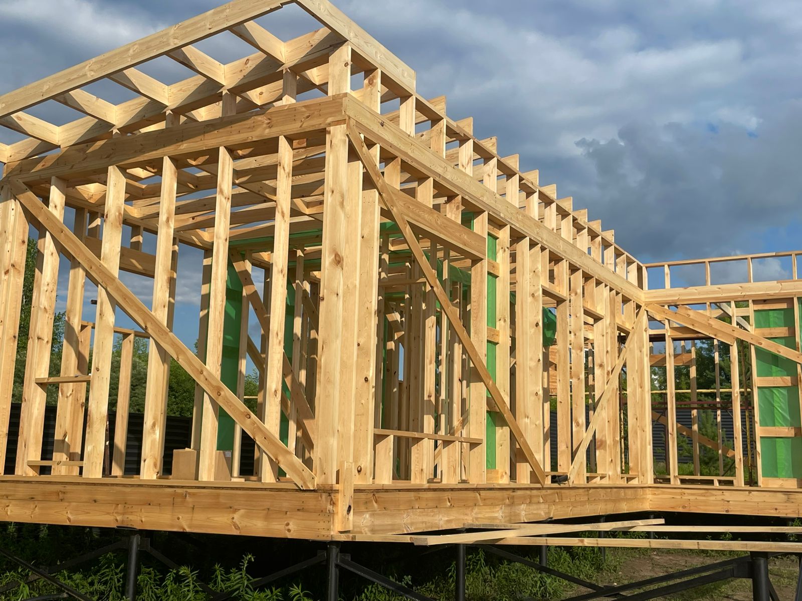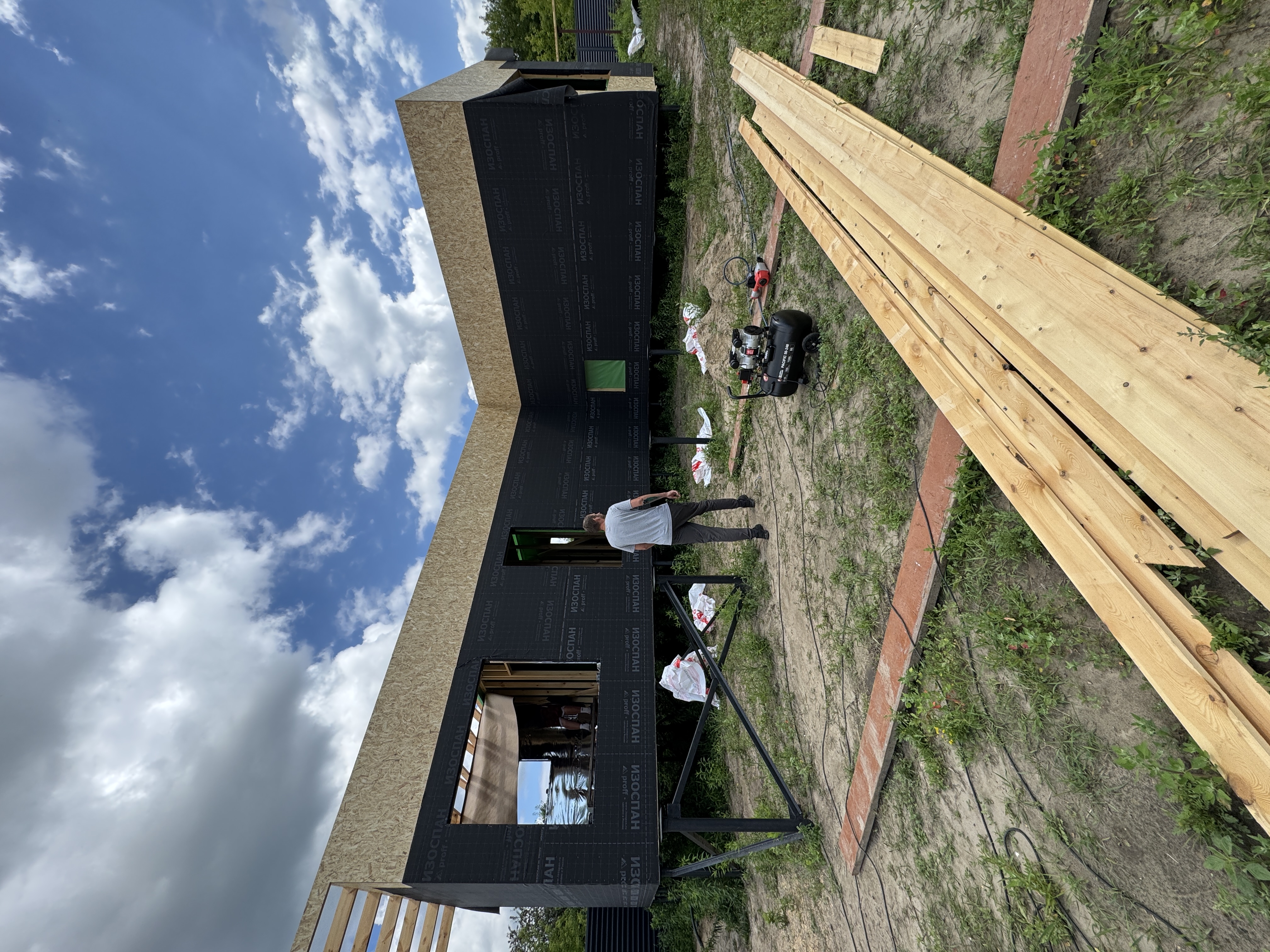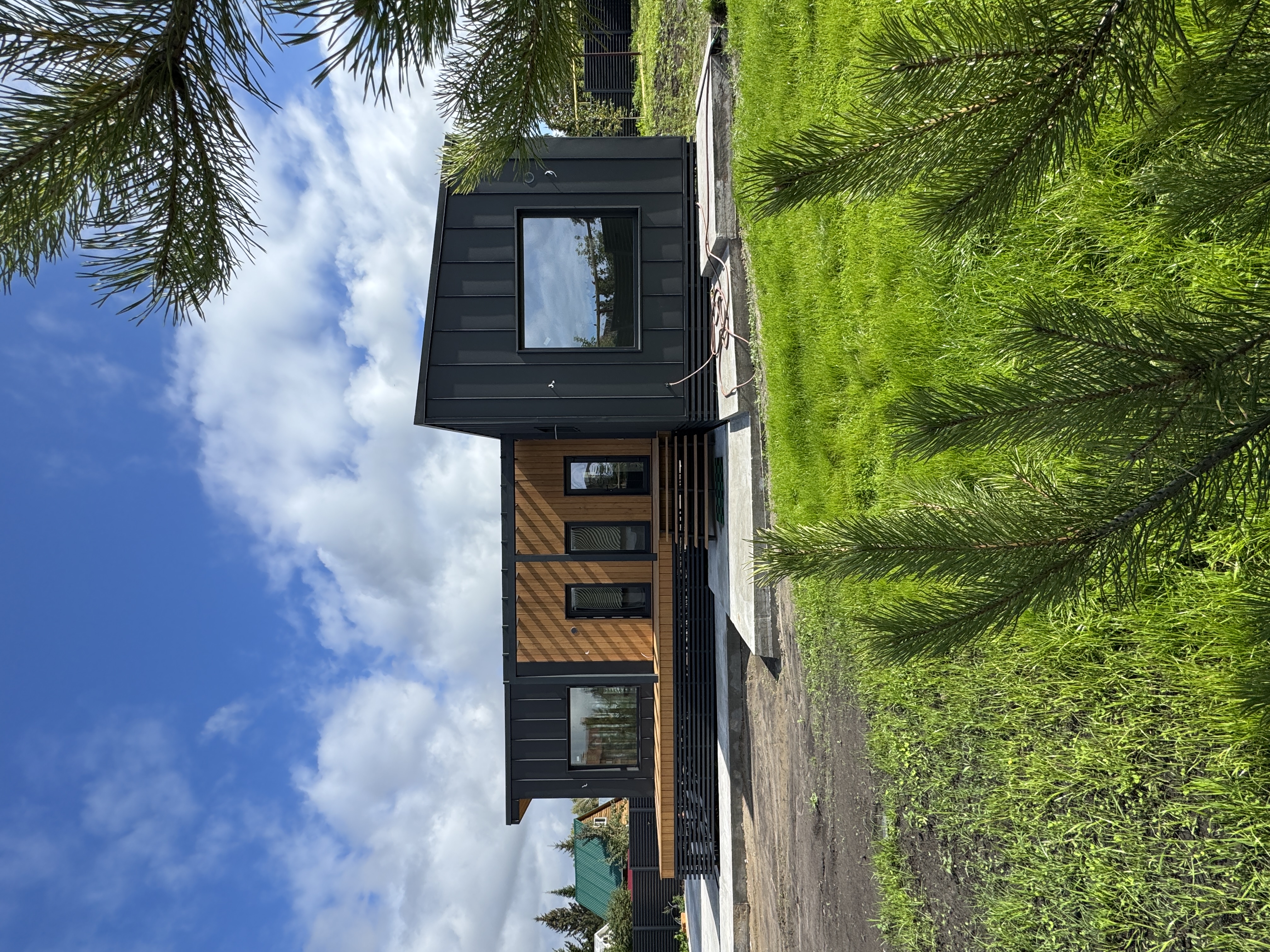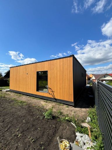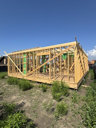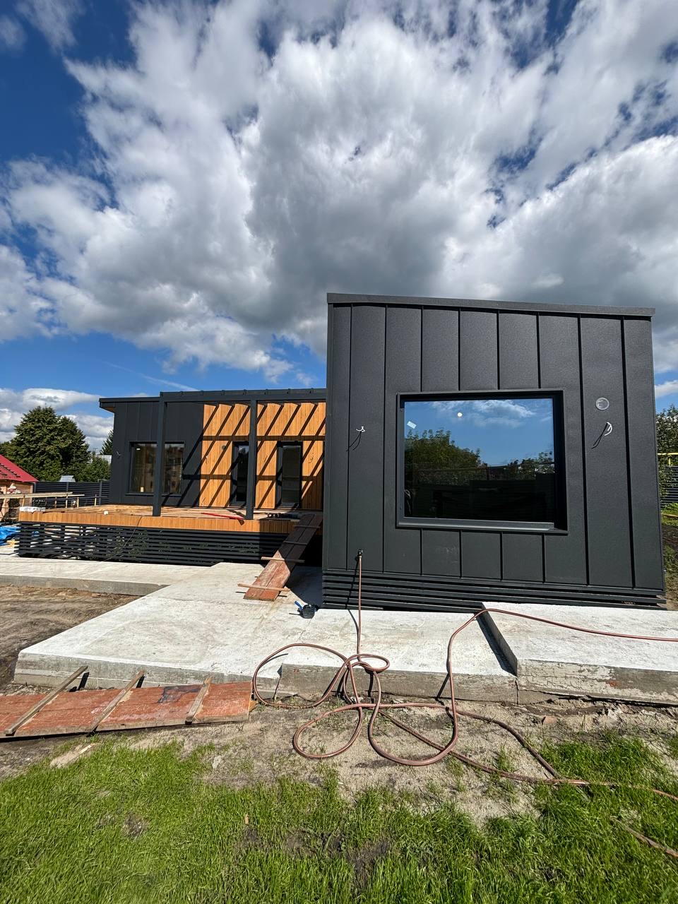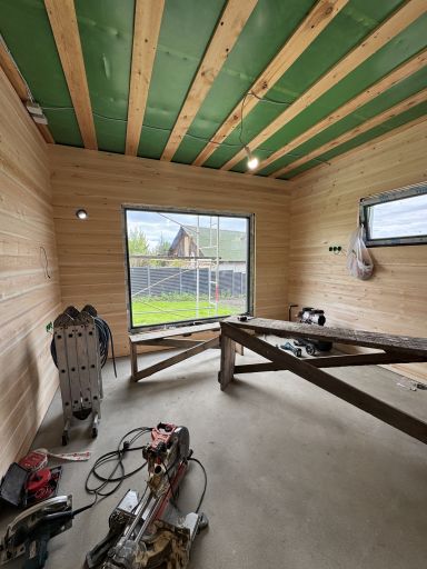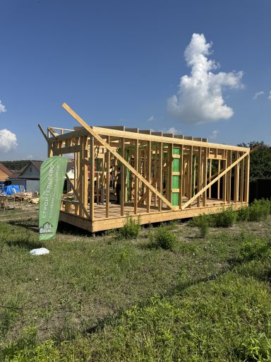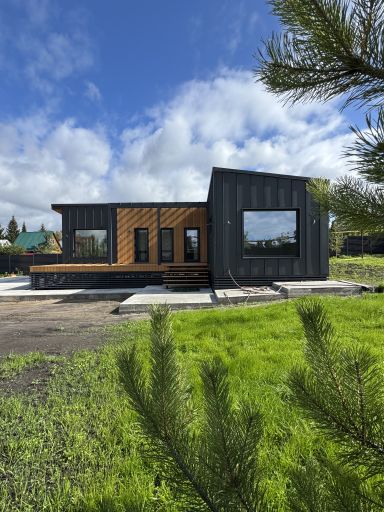 Каркасная дом-баня по нашему типовому проекту находящийся в п. Кирово. Фундамент винтовые сваи. Толщина теплоизоляции стен 150 мм , кровли 200 мм , фасад комбинированный из кликфальца и дерева, кровля фальцевая, внутренняя отделка ГКЛ/вагонка штиль.