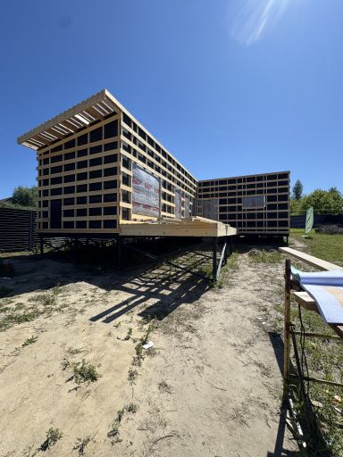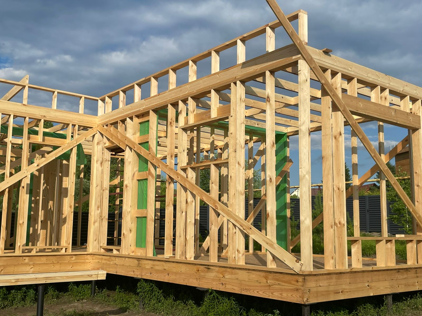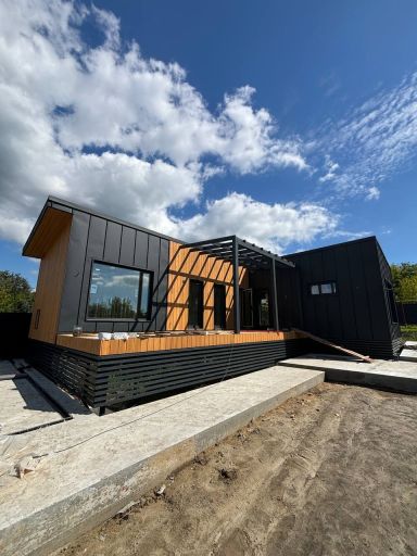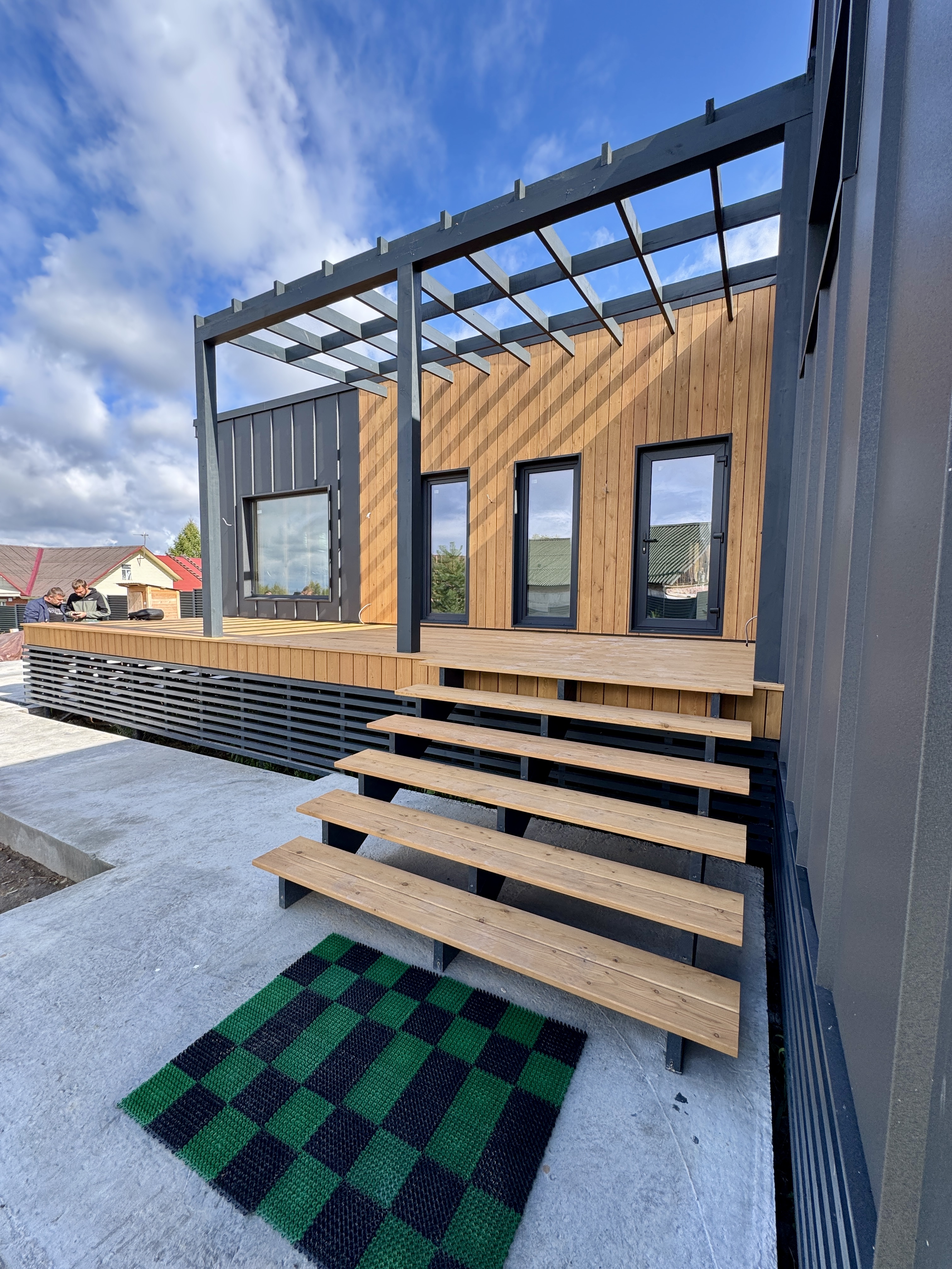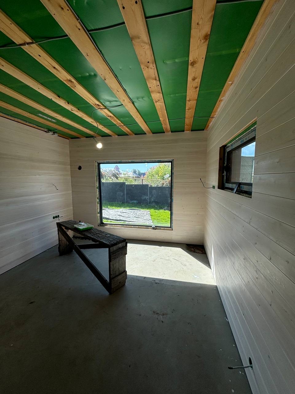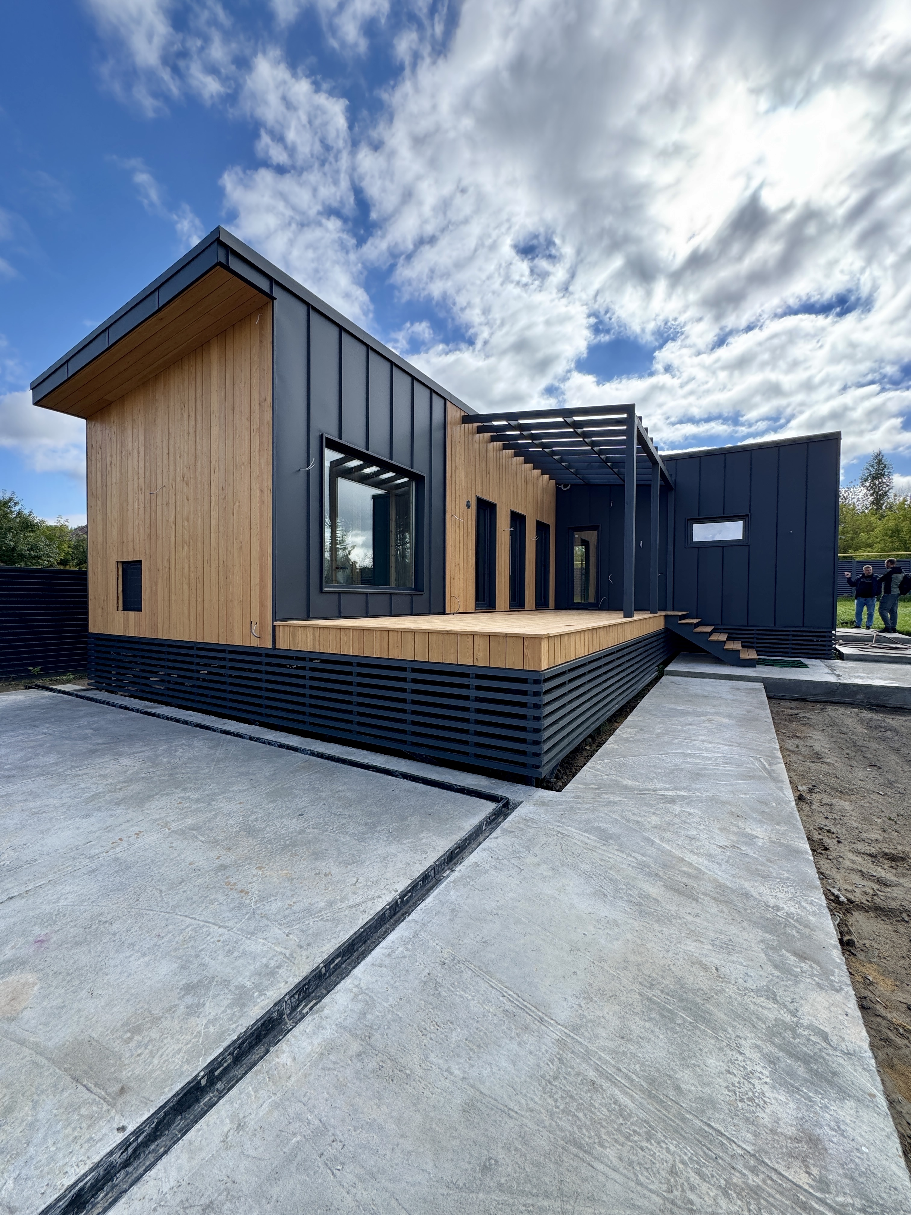 Каркасная дом-баня по нашему типовому проекту находящийся в п. Кирово. Фундамент винтовые сваи. Толщина теплоизоляции стен 150 мм , кровли 200 мм , фасад комбинированный из кликфальца и дерева, кровля фальцевая, внутренняя отделка ГКЛ/вагонка штиль.