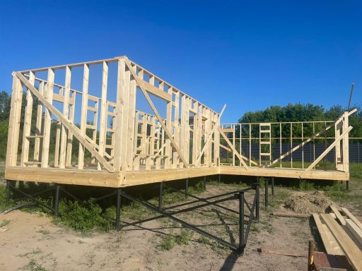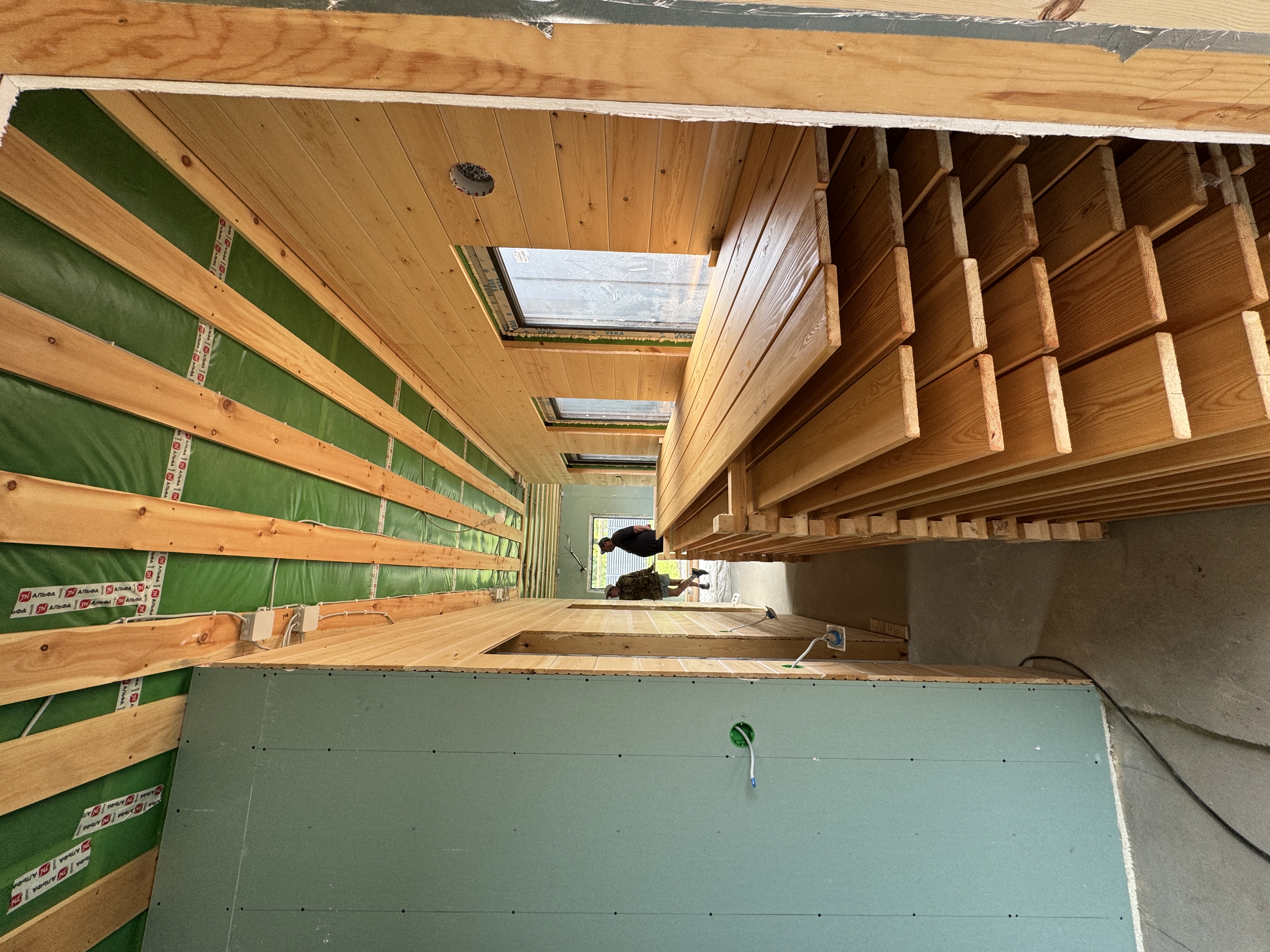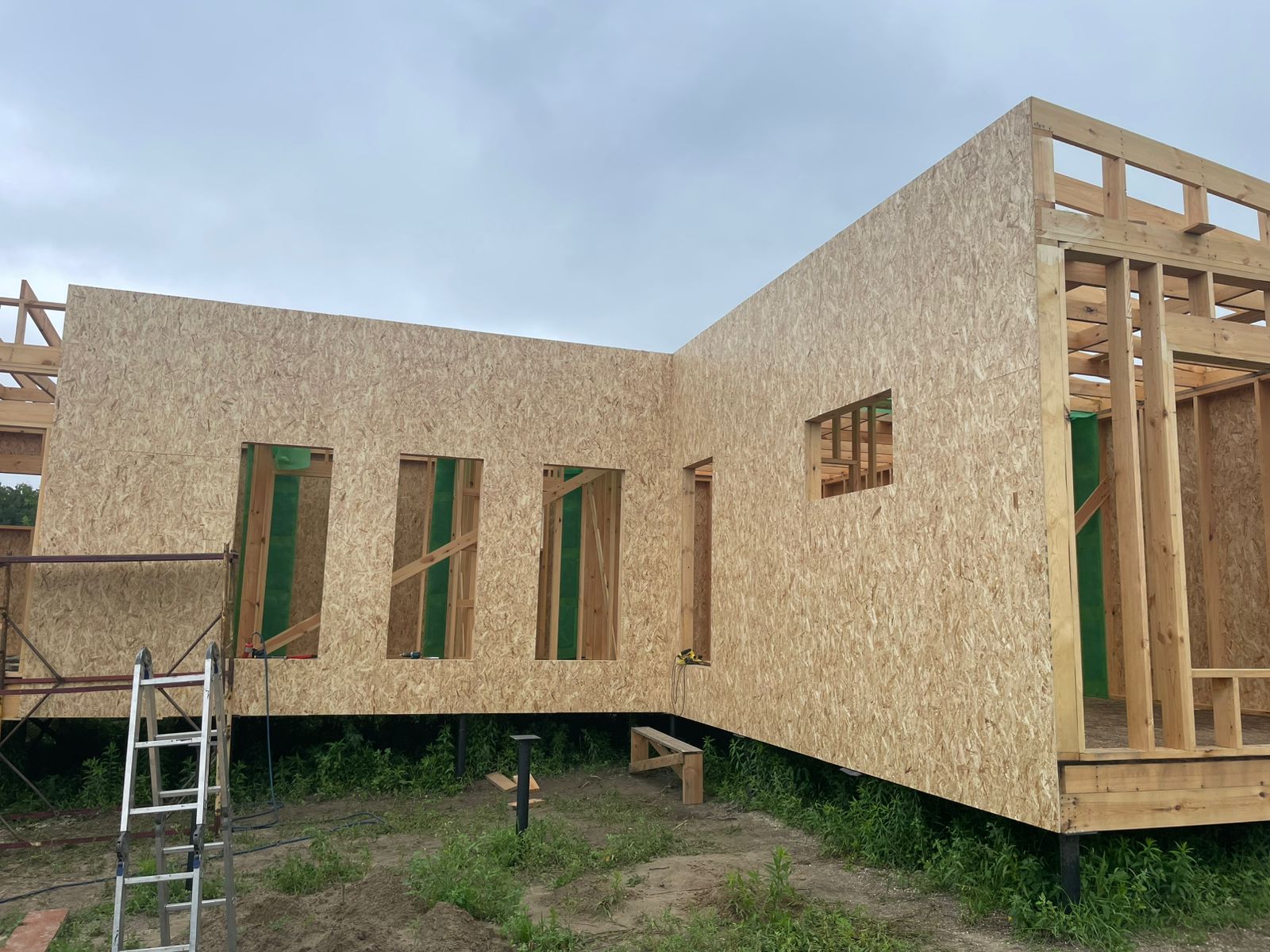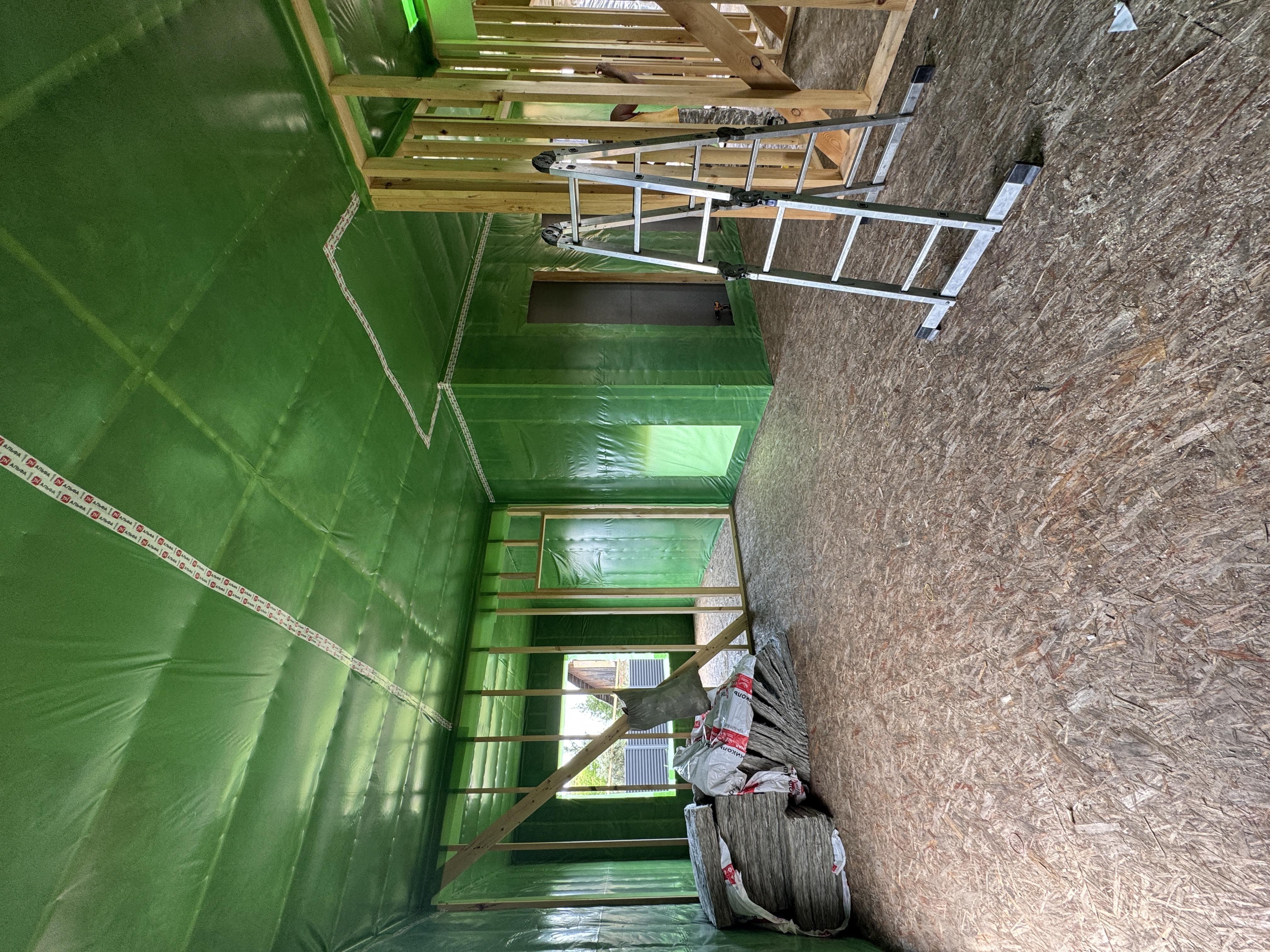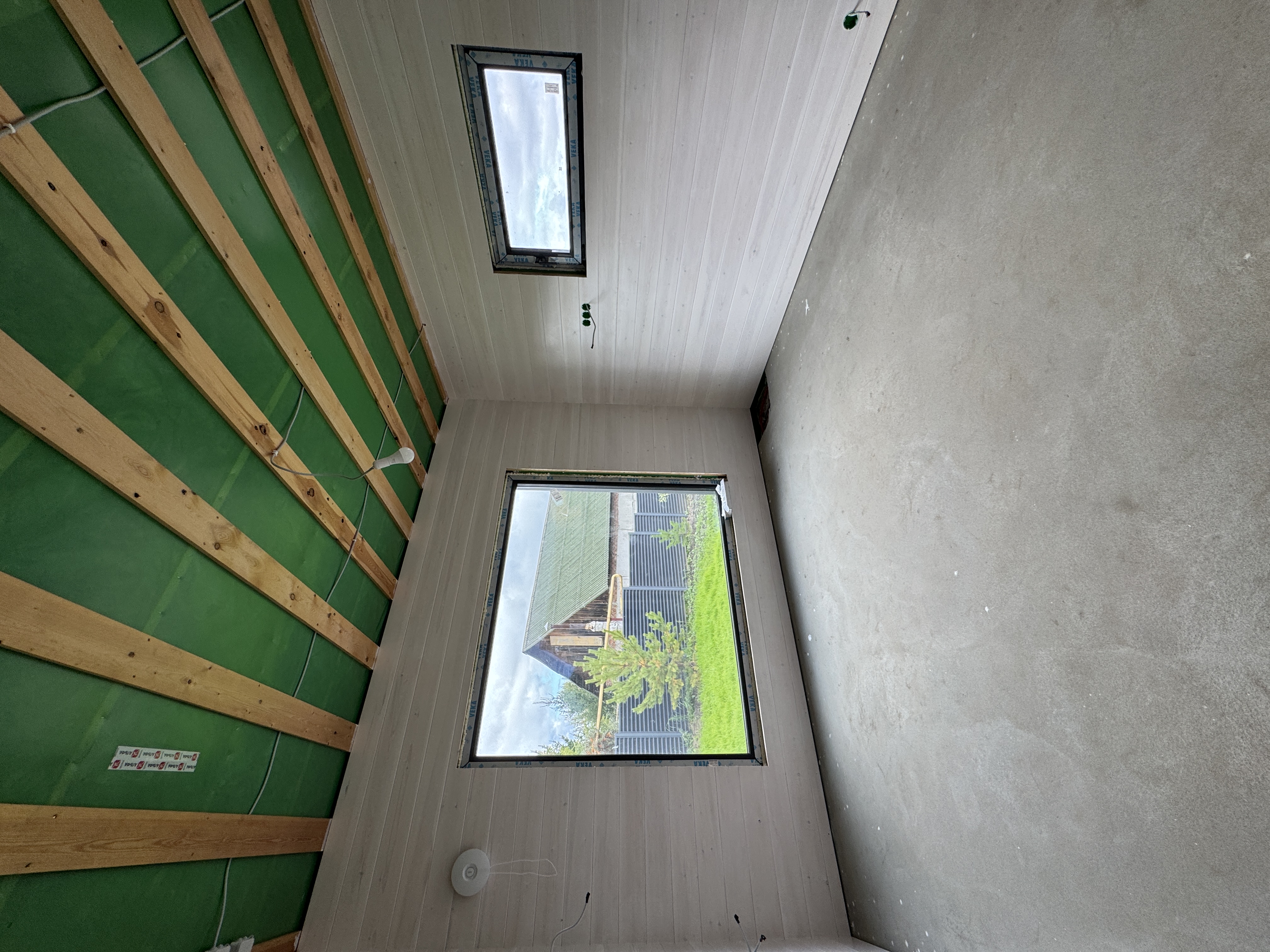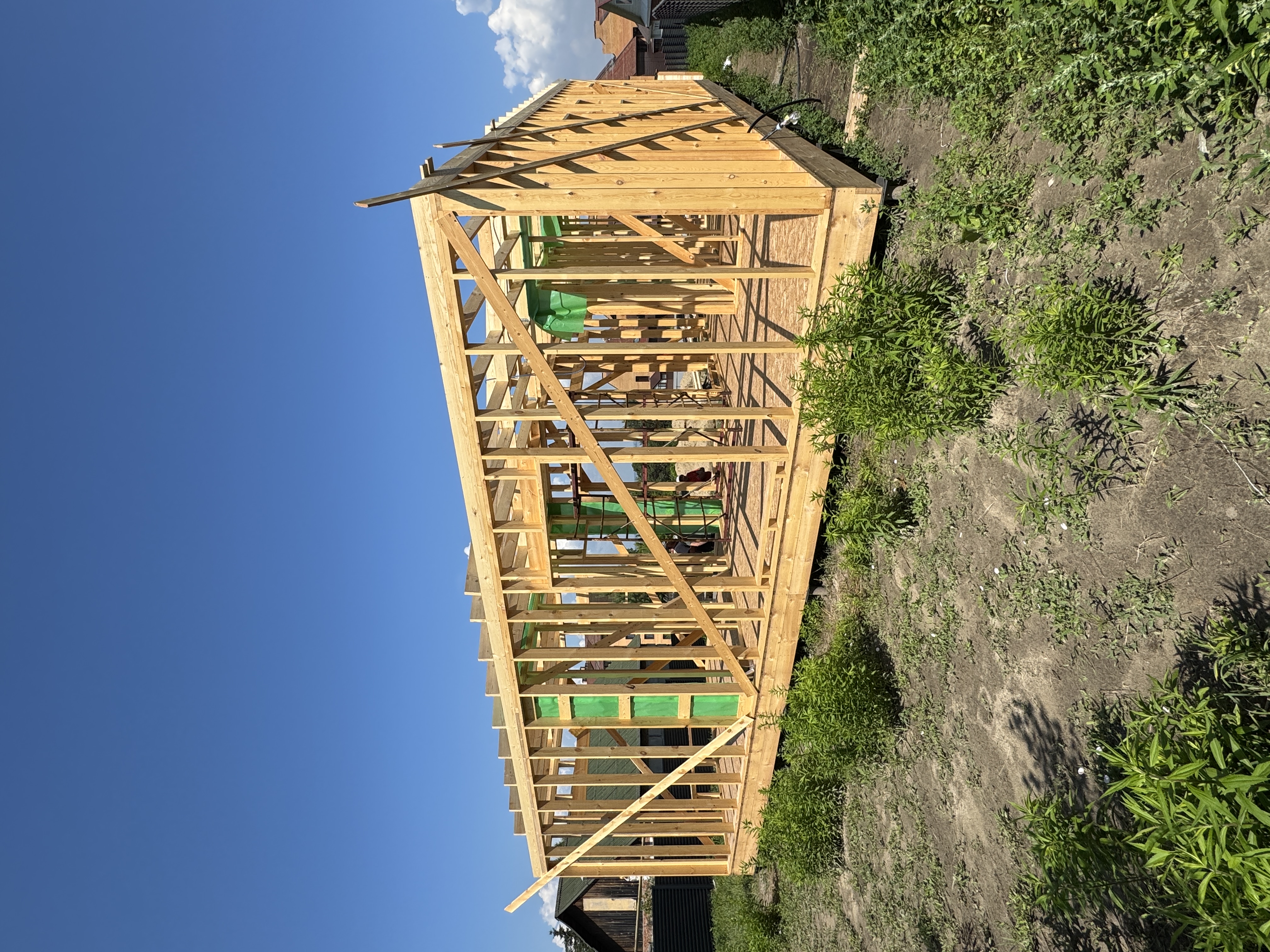 Каркасная дом-баня по нашему типовому проекту находящийся в п. Кирово. Фундамент винтовые сваи. Толщина теплоизоляции стен 150 мм , кровли 200 мм , фасад комбинированный из кликфальца и дерева, кровля фальцевая, внутренняя отделка ГКЛ/вагонка штиль.