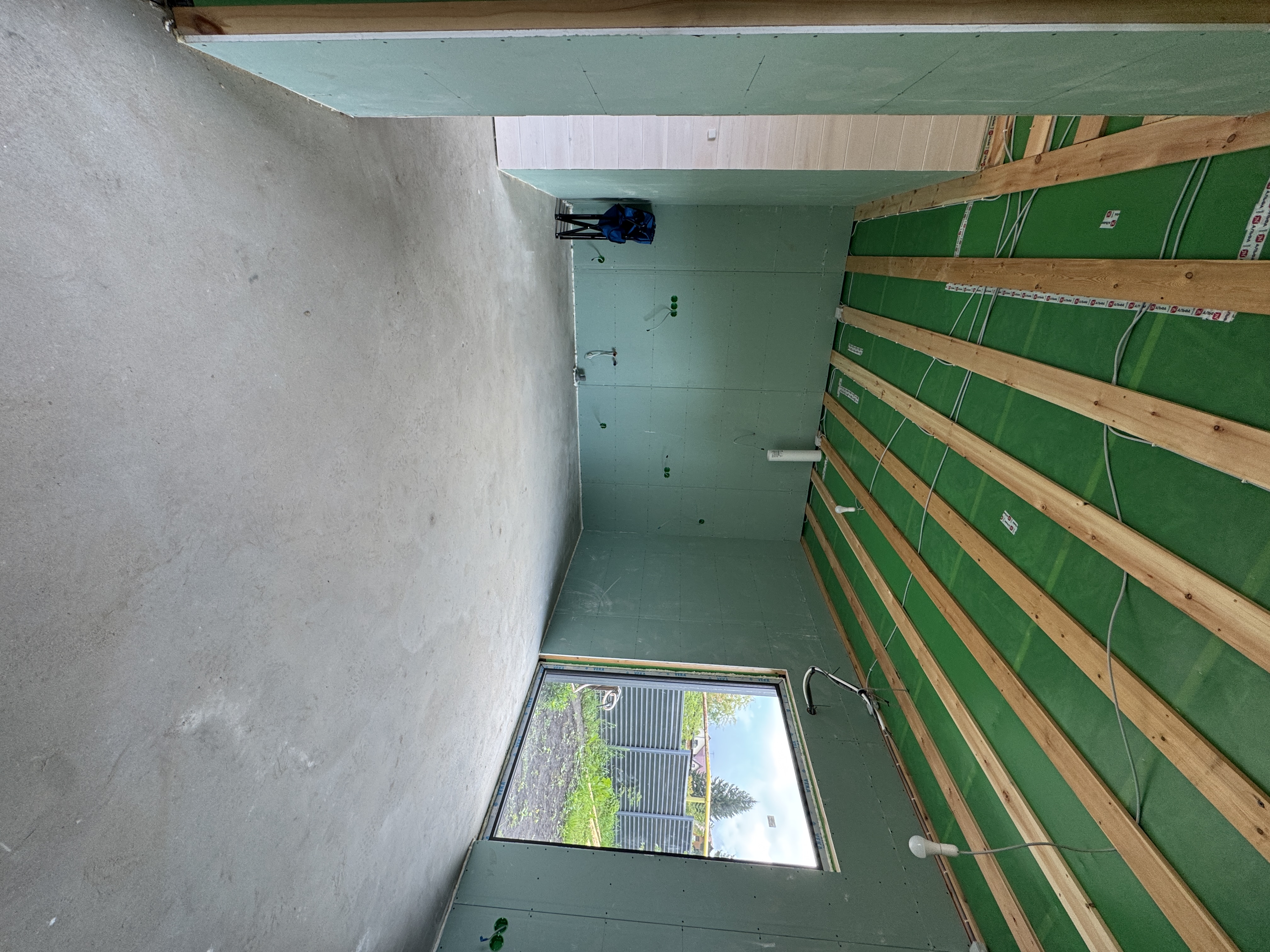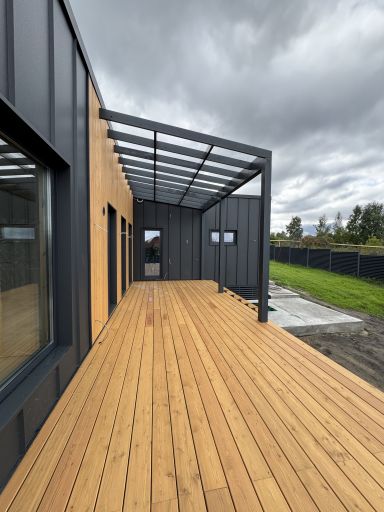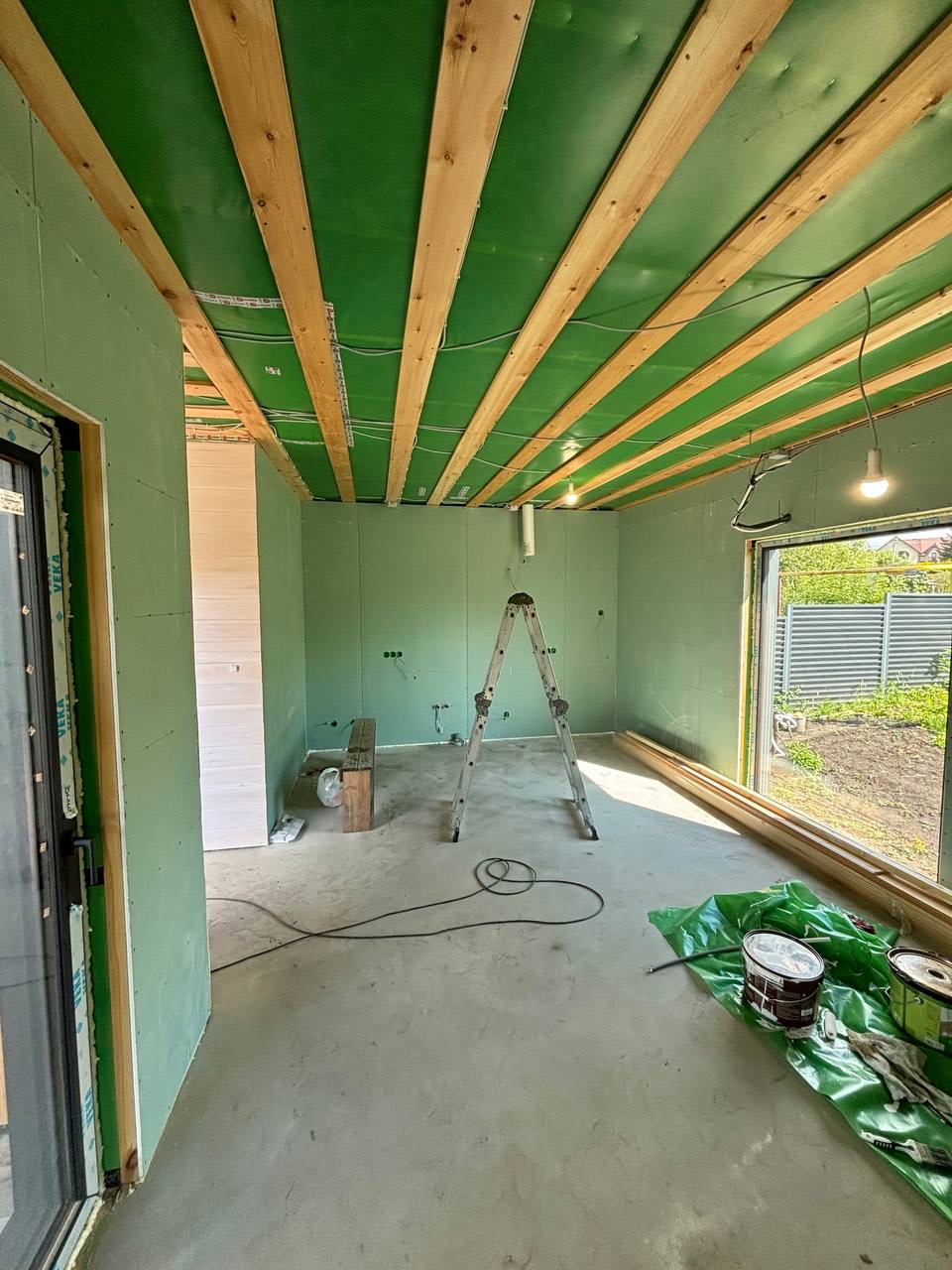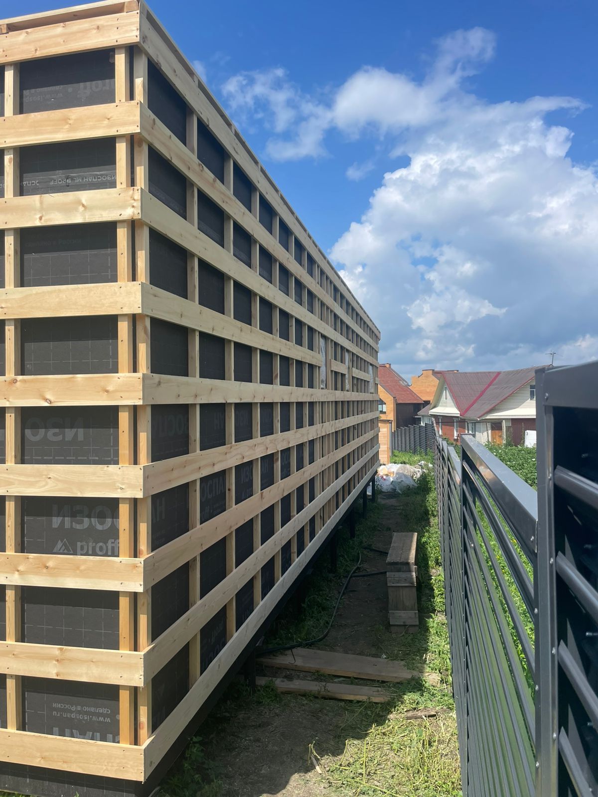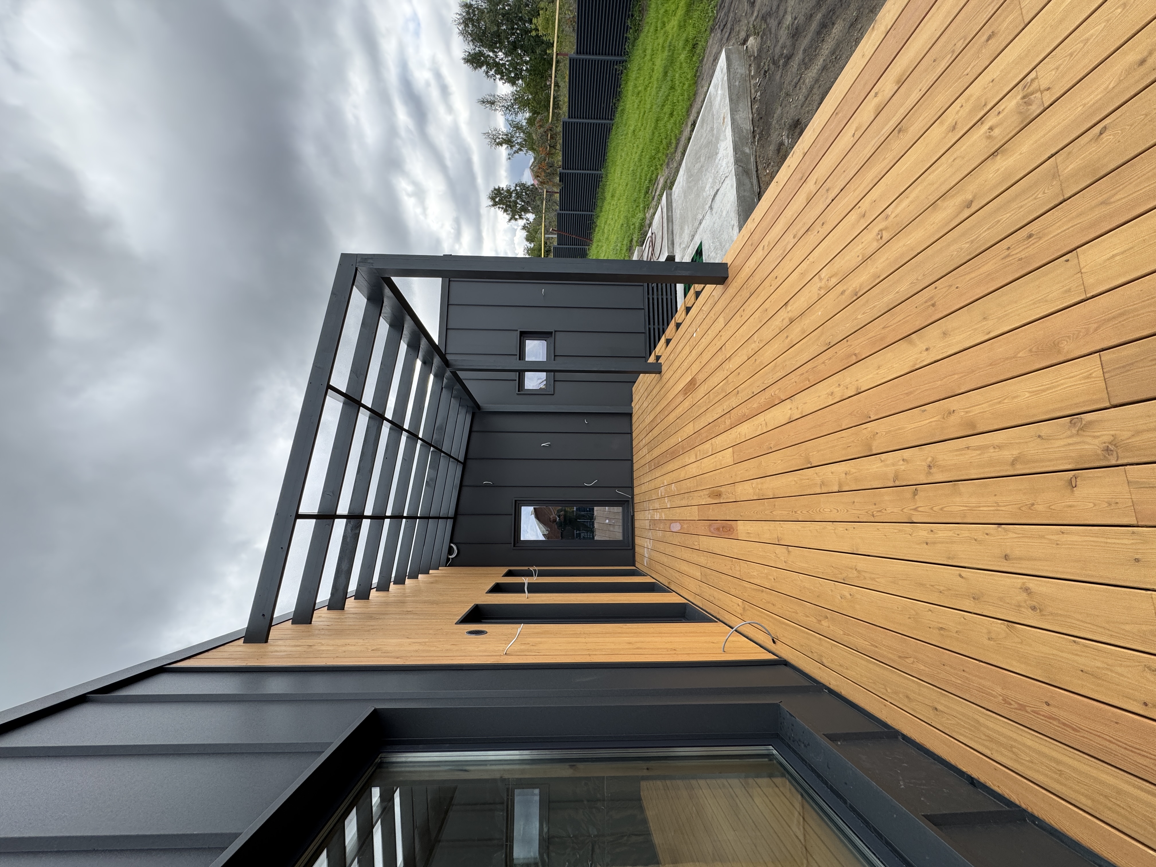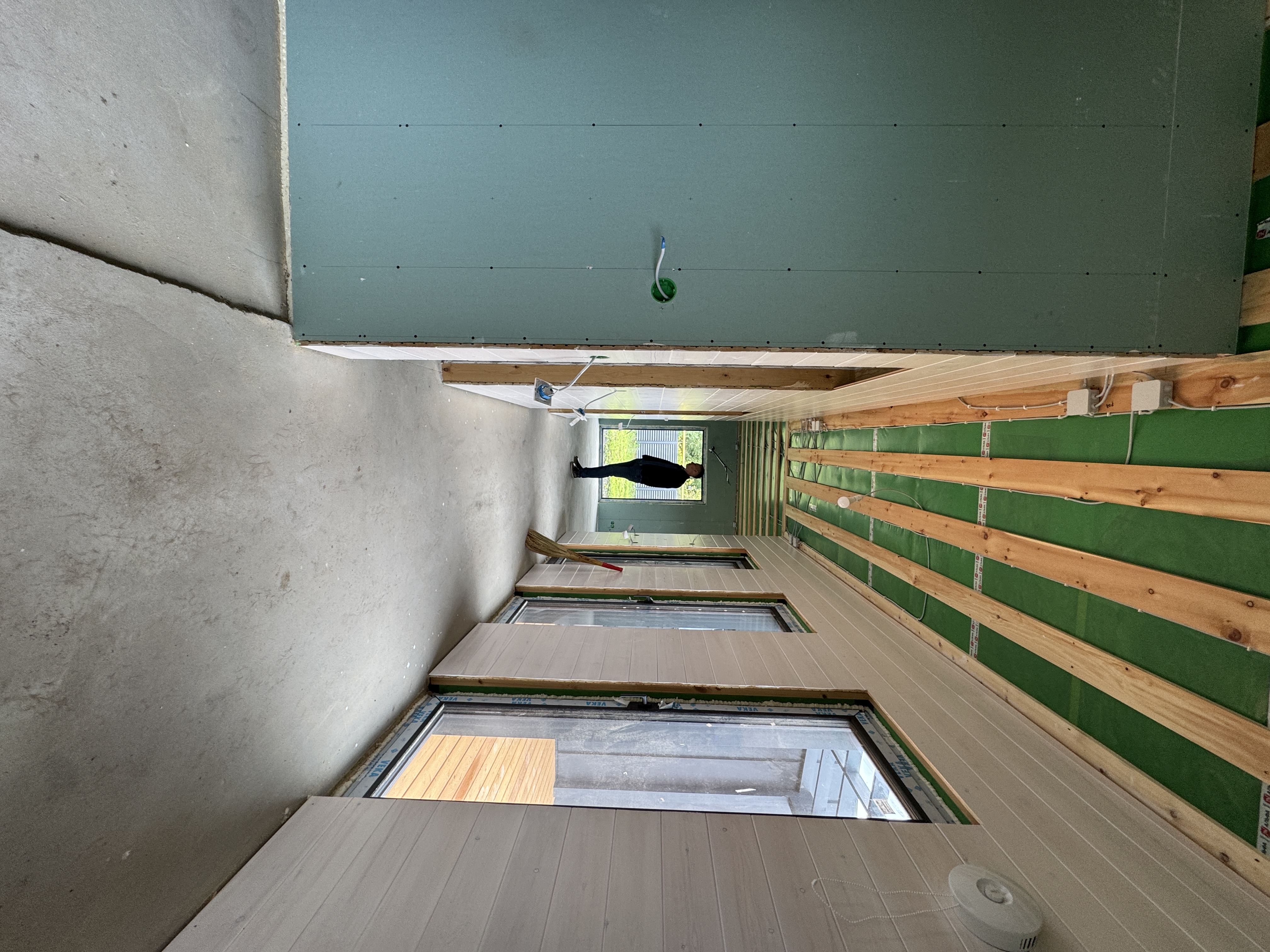 Каркасная дом-баня по нашему типовому проекту находящийся в п. Кирово. Фундамент винтовые сваи. Толщина теплоизоляции стен 150 мм , кровли 200 мм , фасад комбинированный из кликфальца и дерева, кровля фальцевая, внутренняя отделка ГКЛ/вагонка штиль.