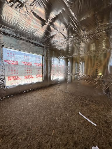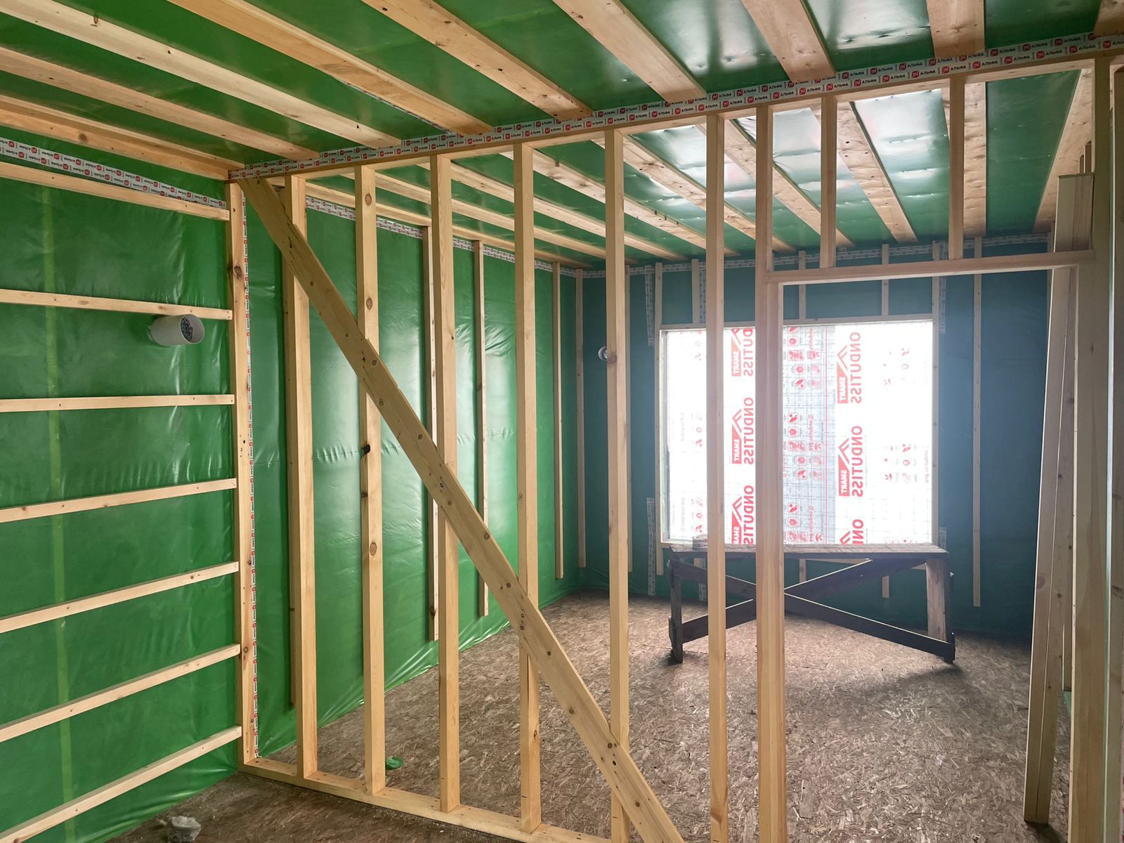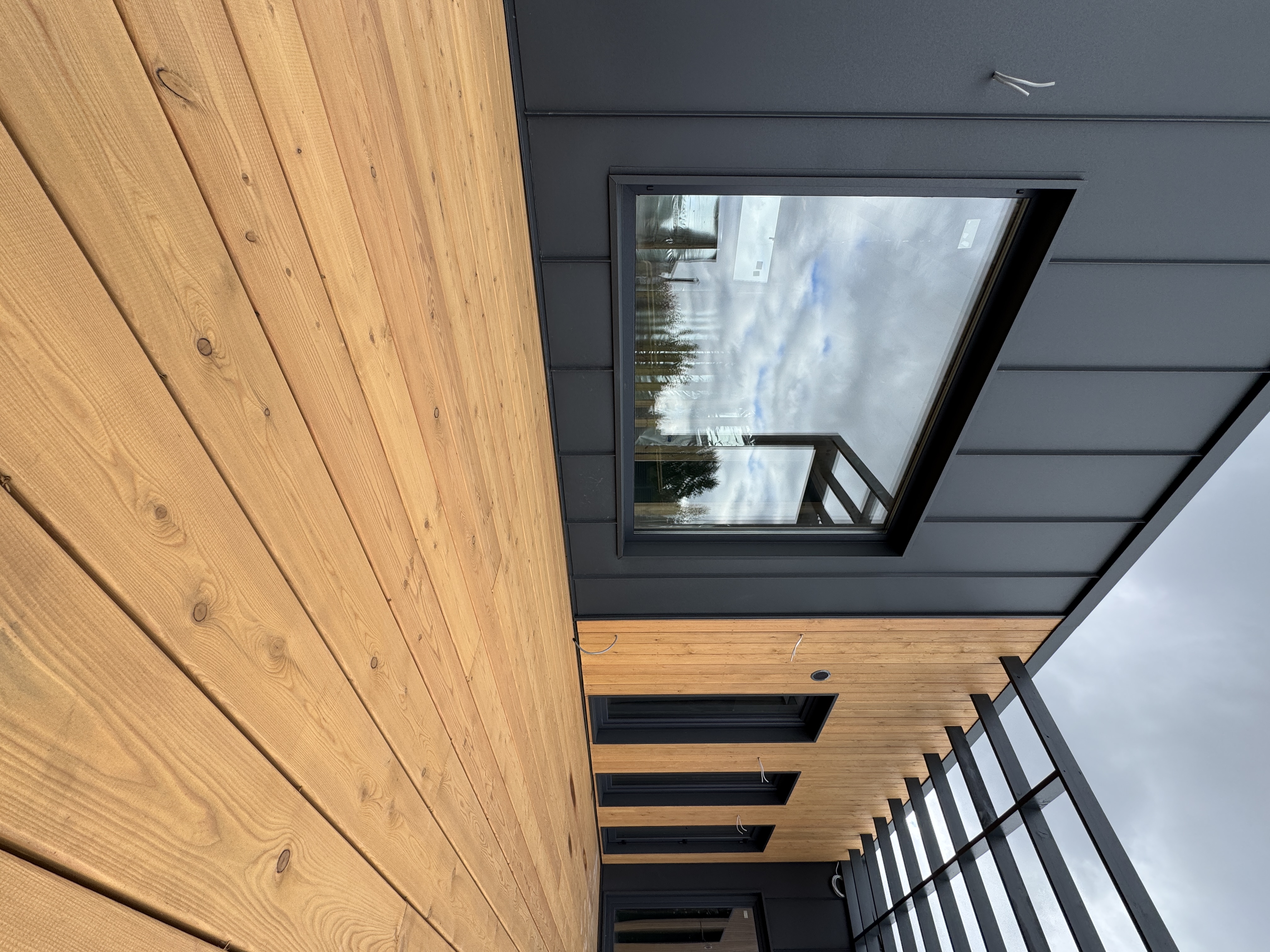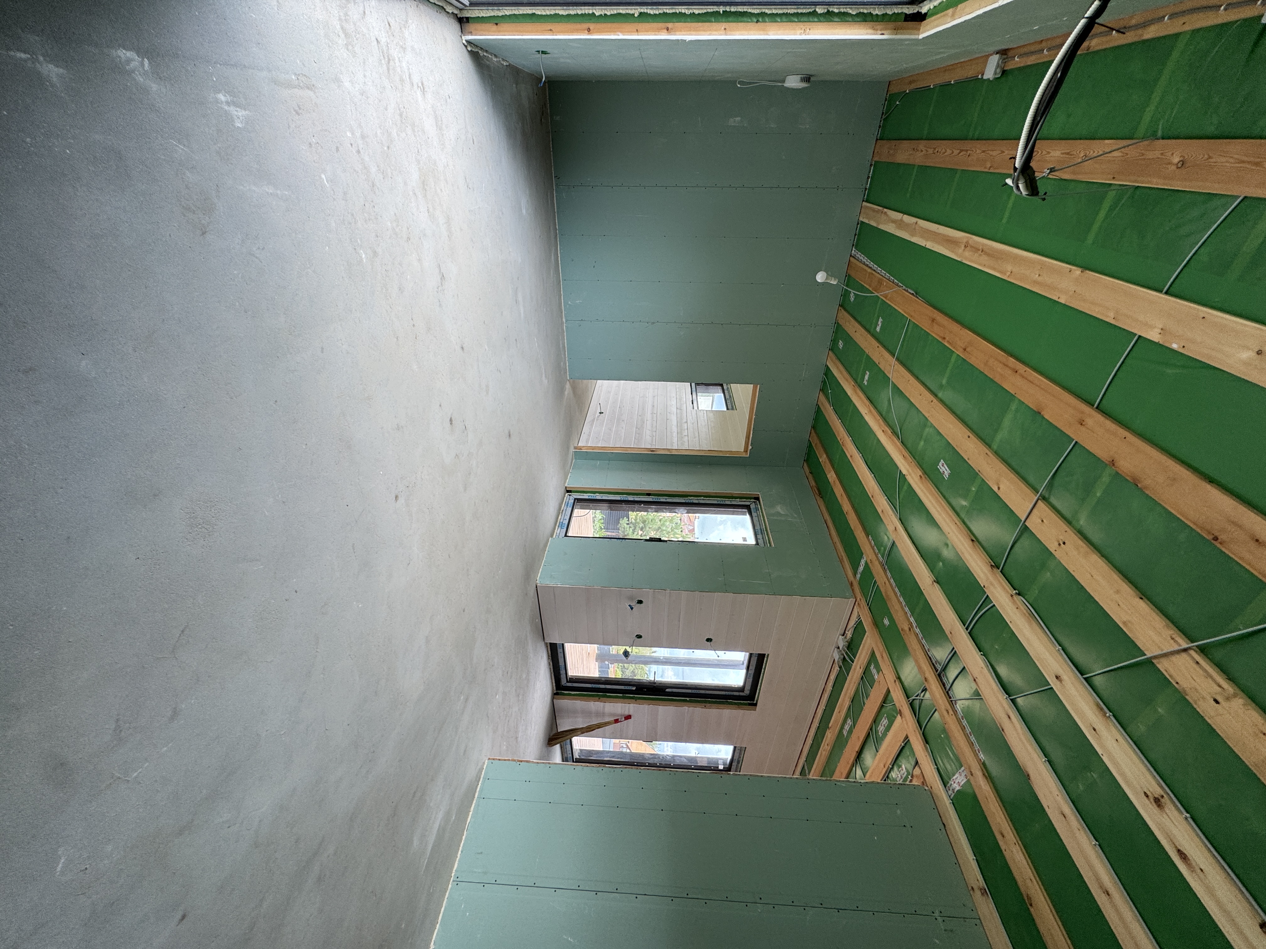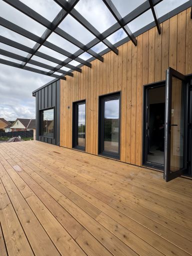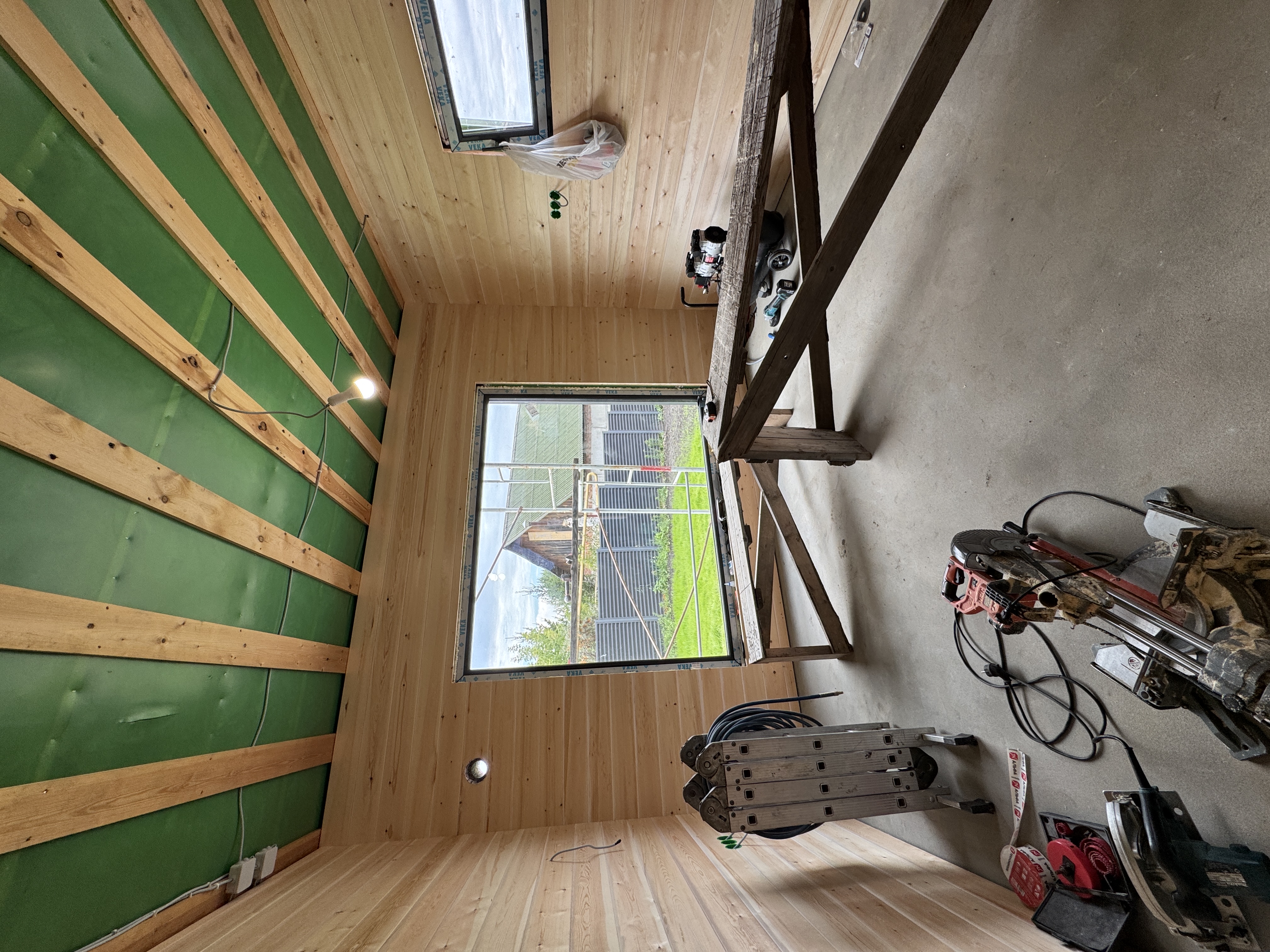 Каркасная дом-баня по нашему типовому проекту находящийся в п. Кирово. Фундамент винтовые сваи. Толщина теплоизоляции стен 150 мм , кровли 200 мм , фасад комбинированный из кликфальца и дерева, кровля фальцевая, внутренняя отделка ГКЛ/вагонка штиль.