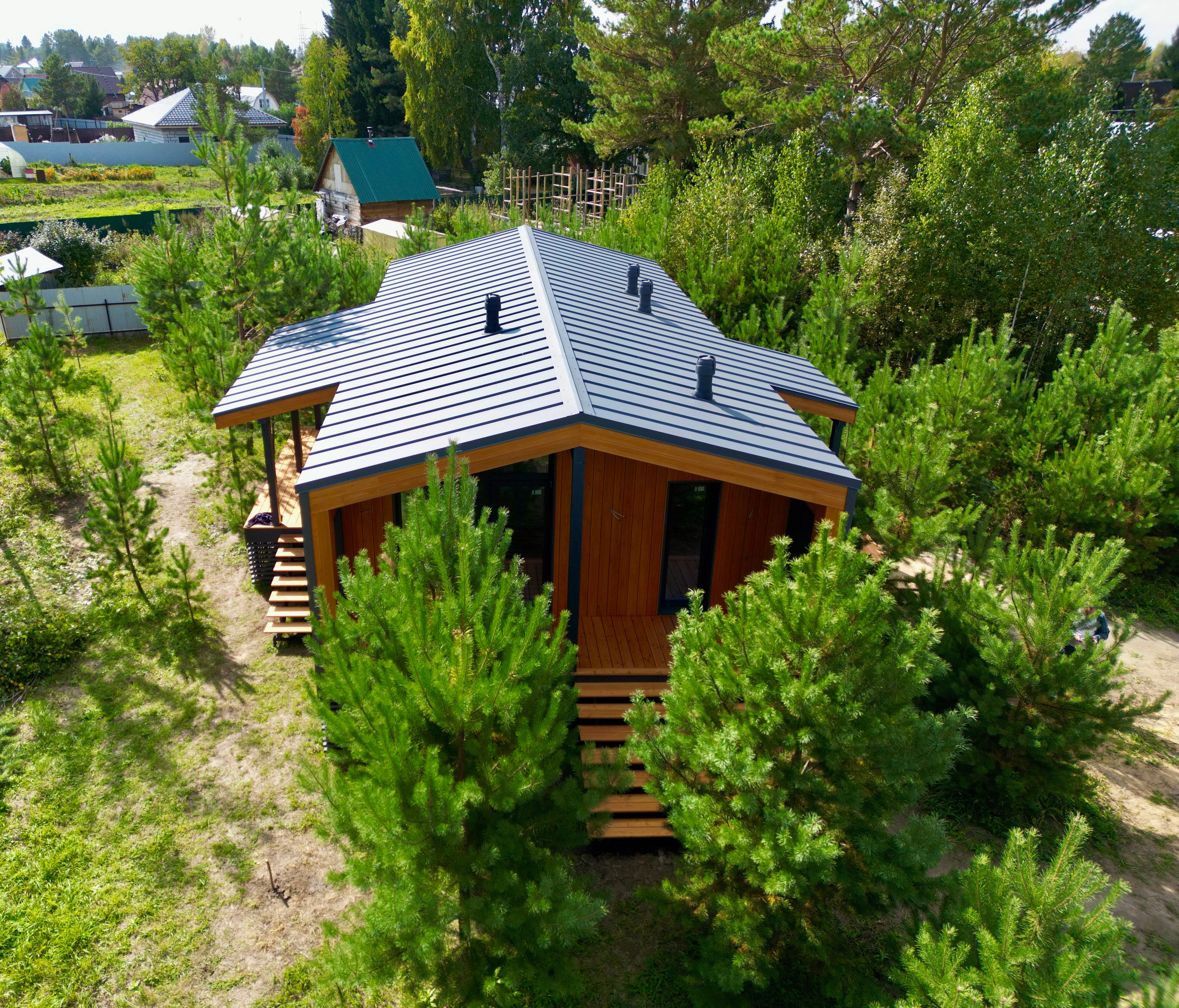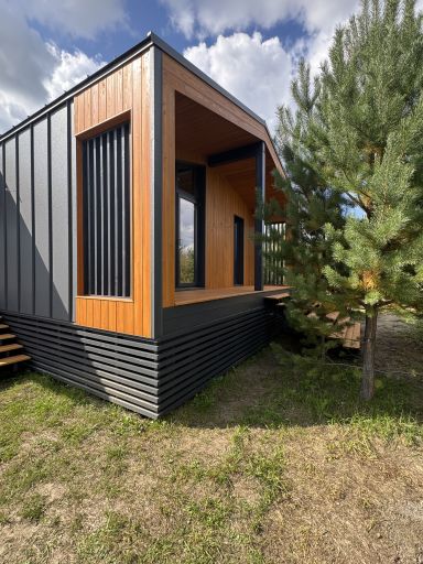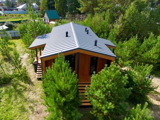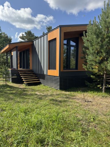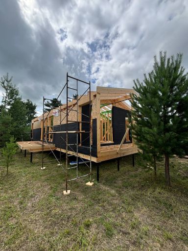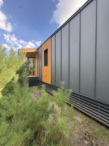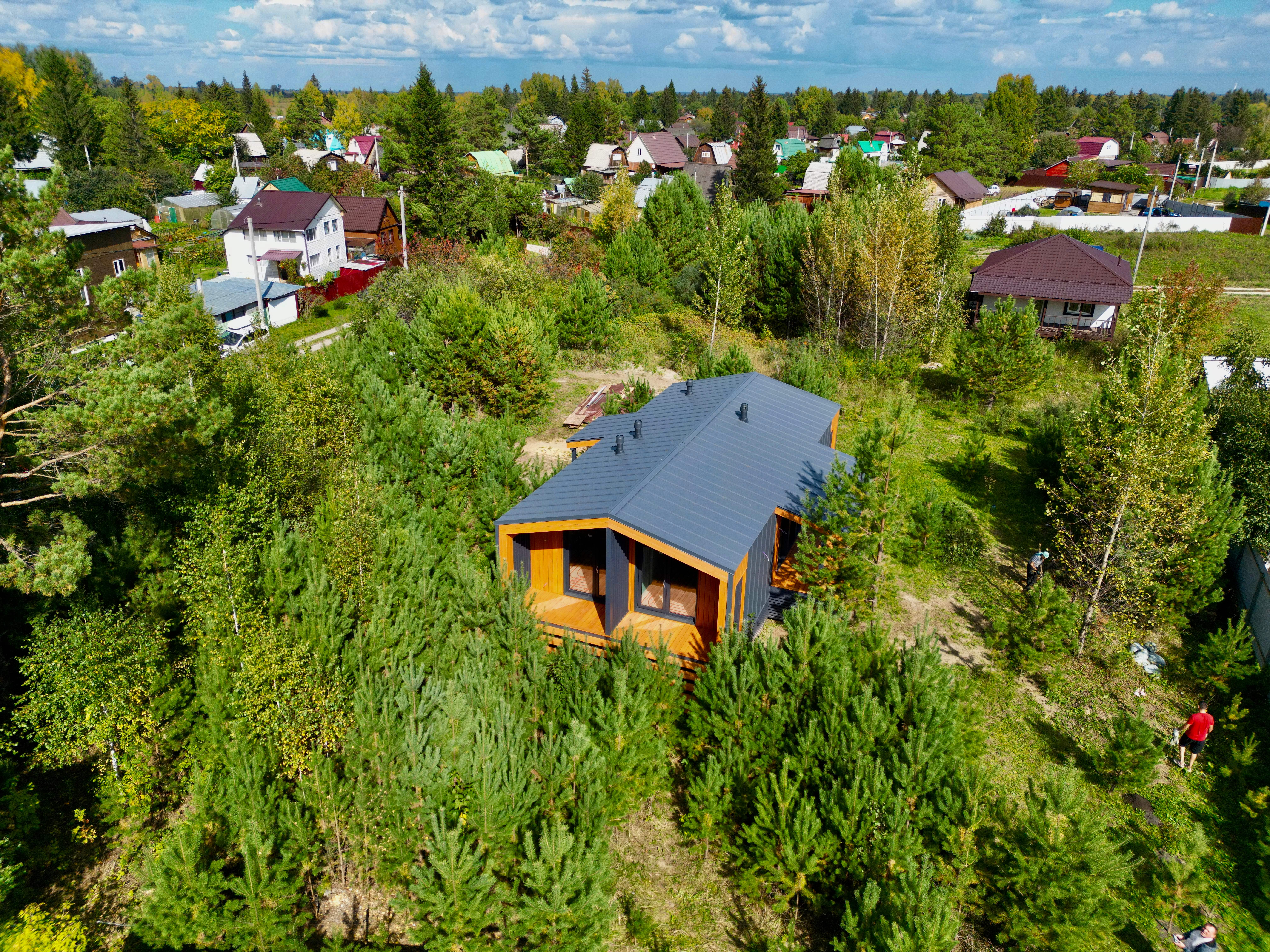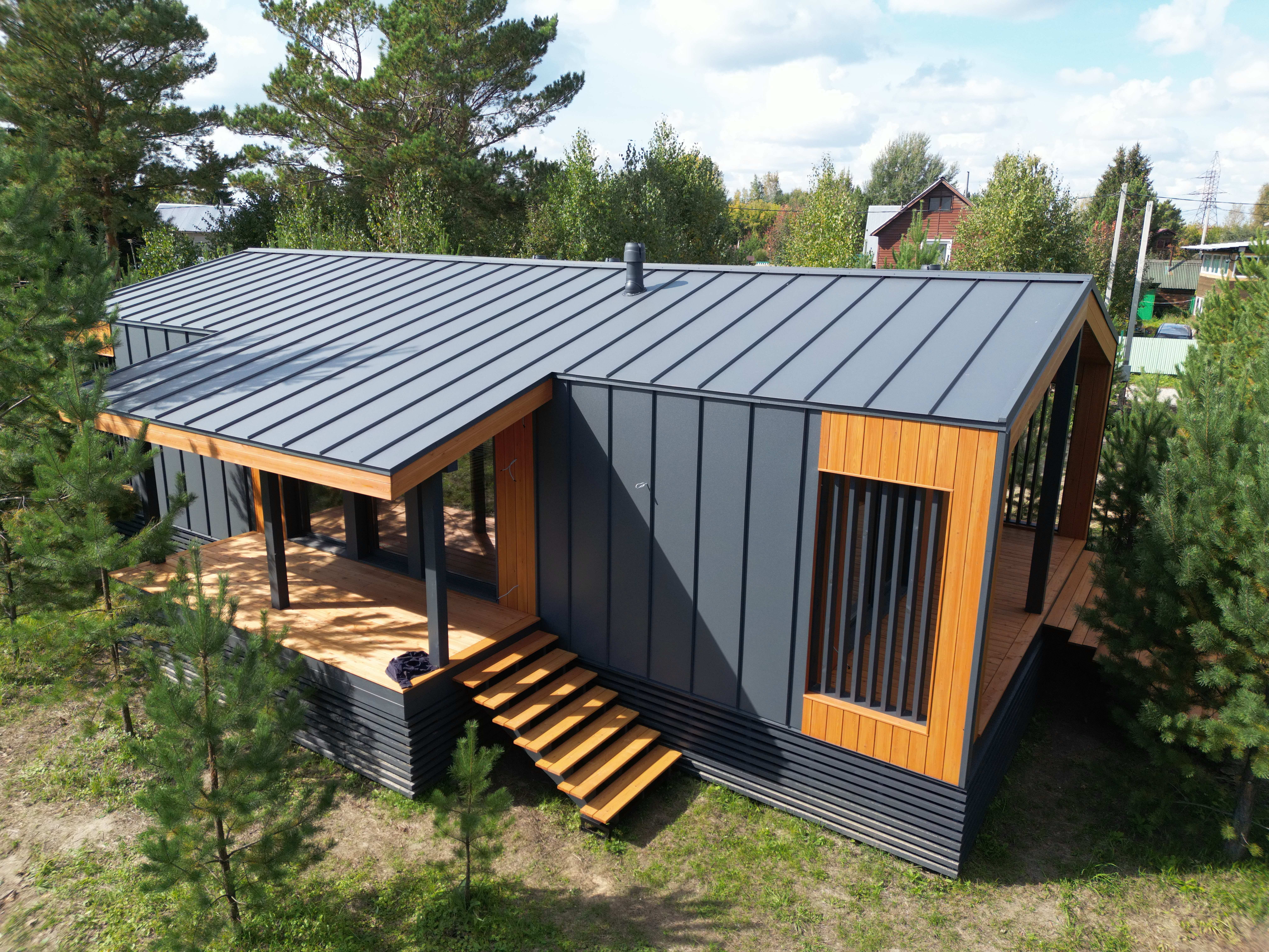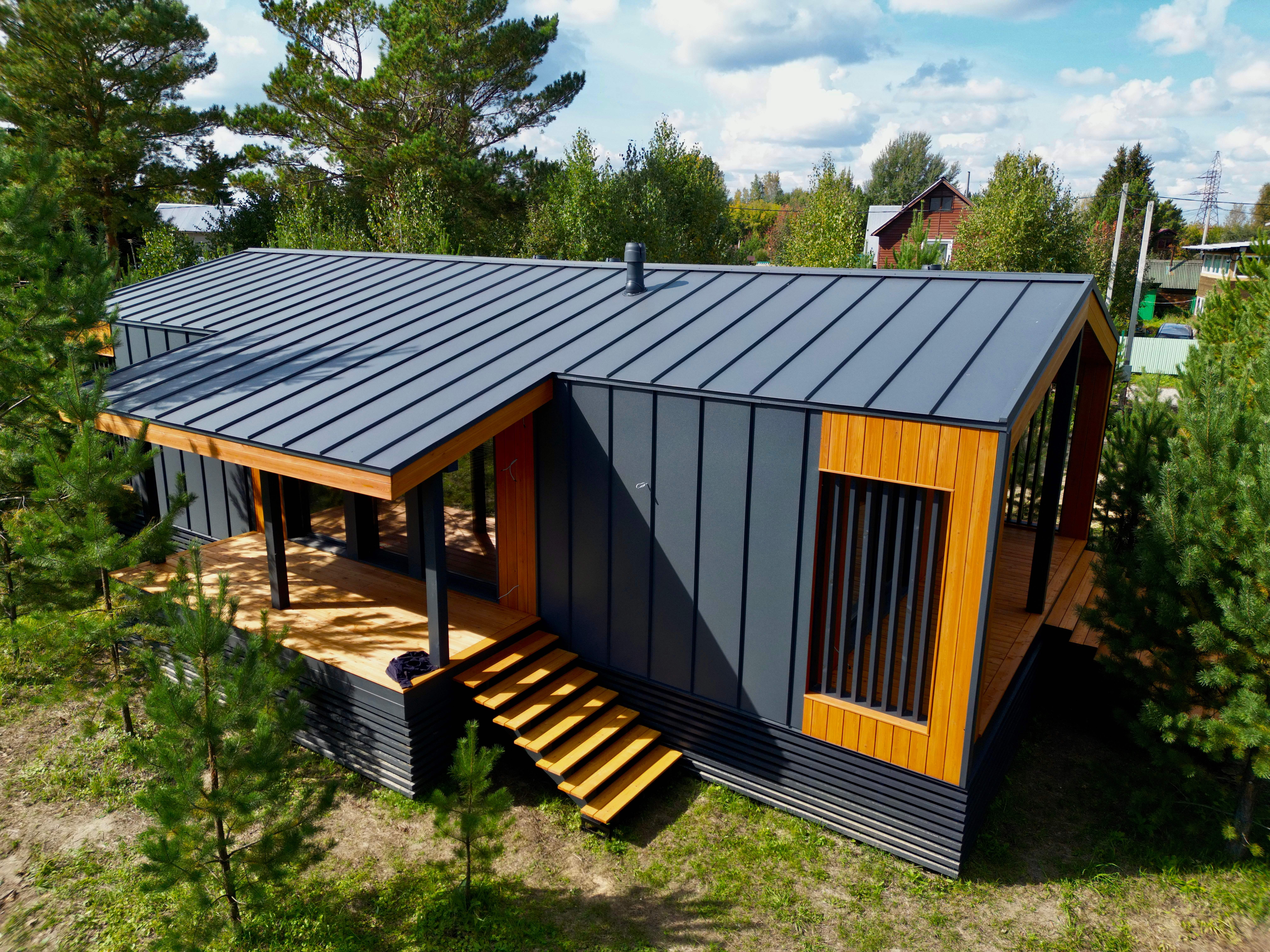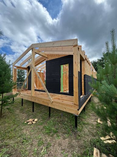 Каркасный дом по нашему типовому проекту находящийся в СНТ "Элеваторщик". Фундамент винтовые сваи. Толщина теплоизоляции стен 200 мм , кровли 300 мм , фасад комбинированный из кликфальца и дерева, кровля фальцевая, внутренняя отделка ГКЛ.