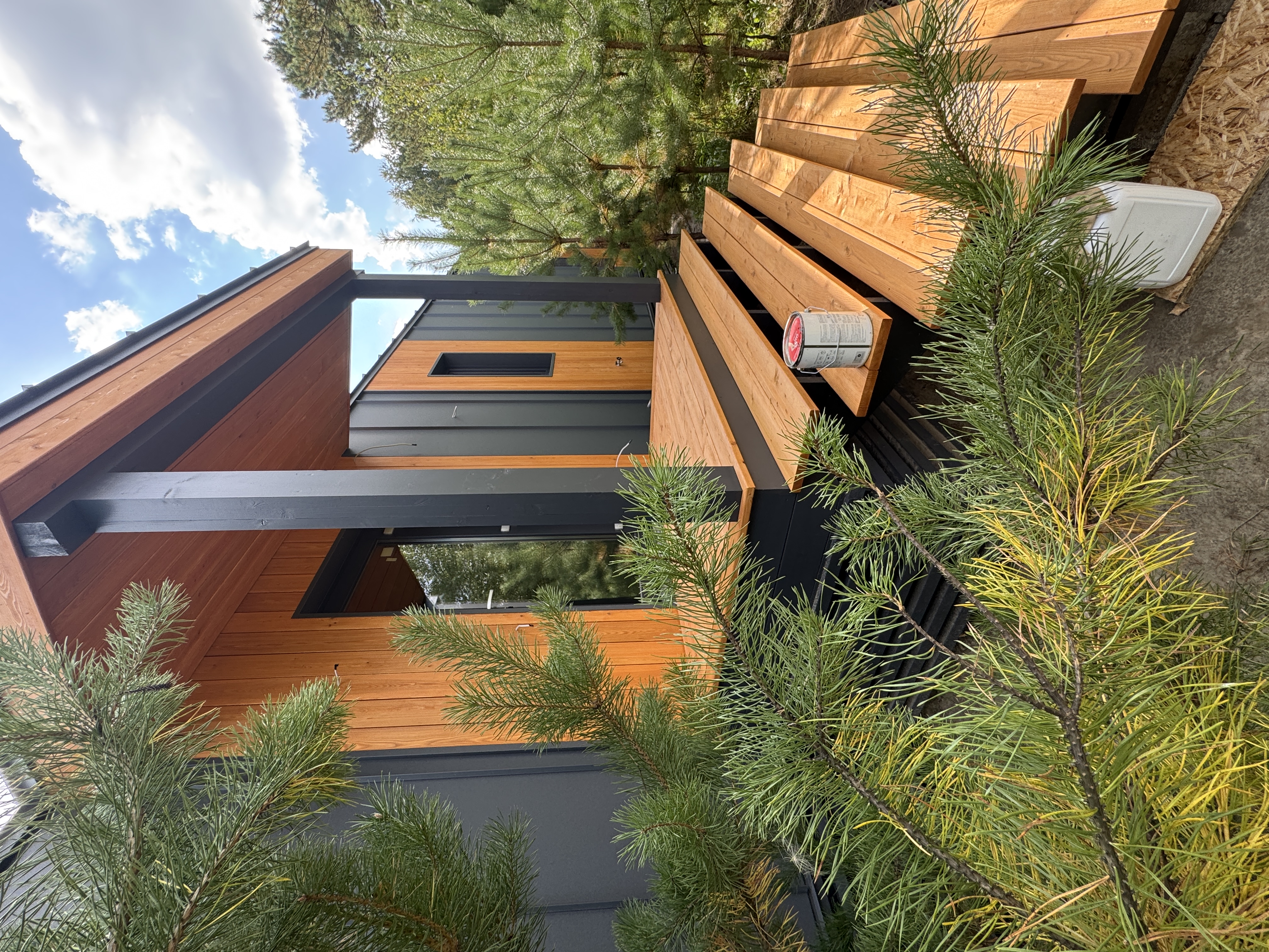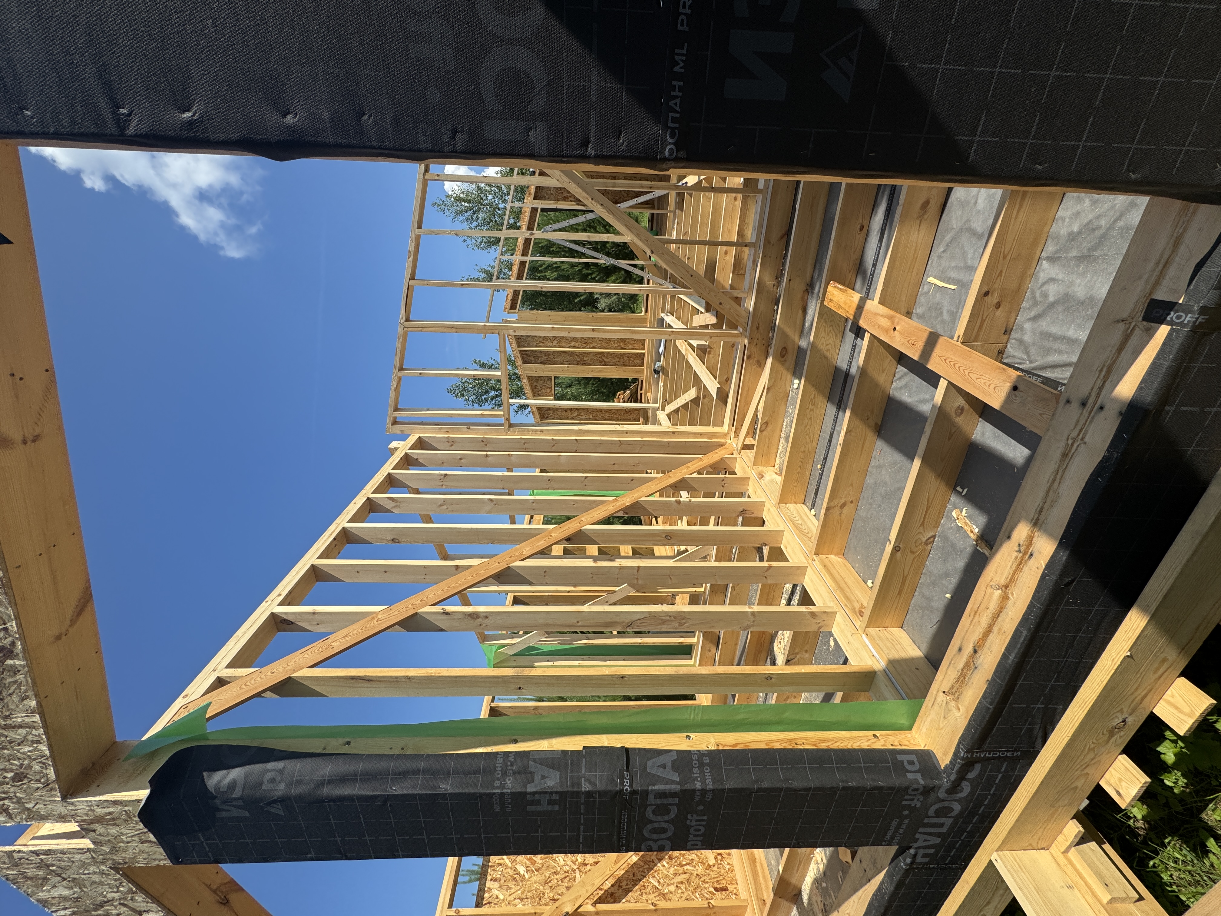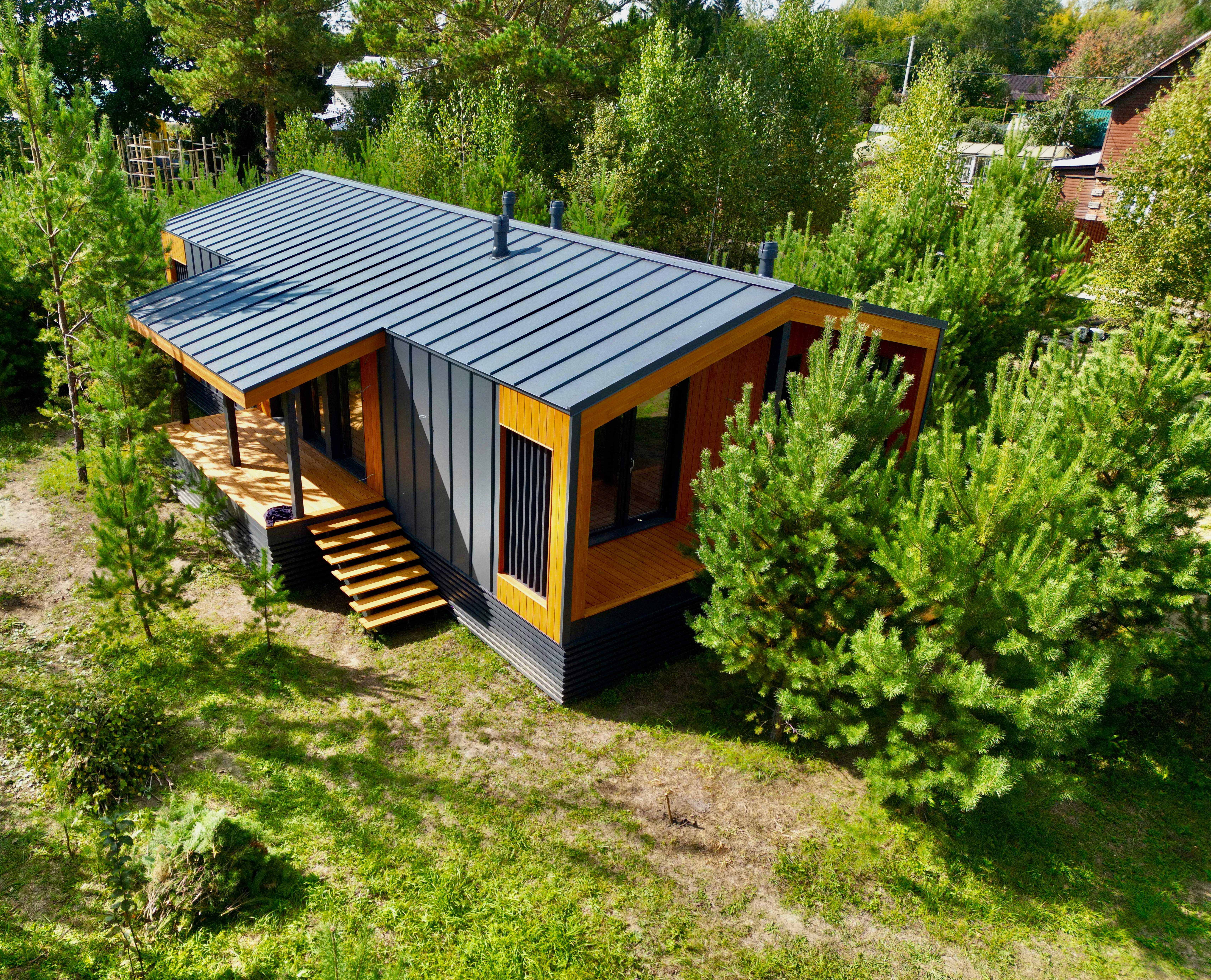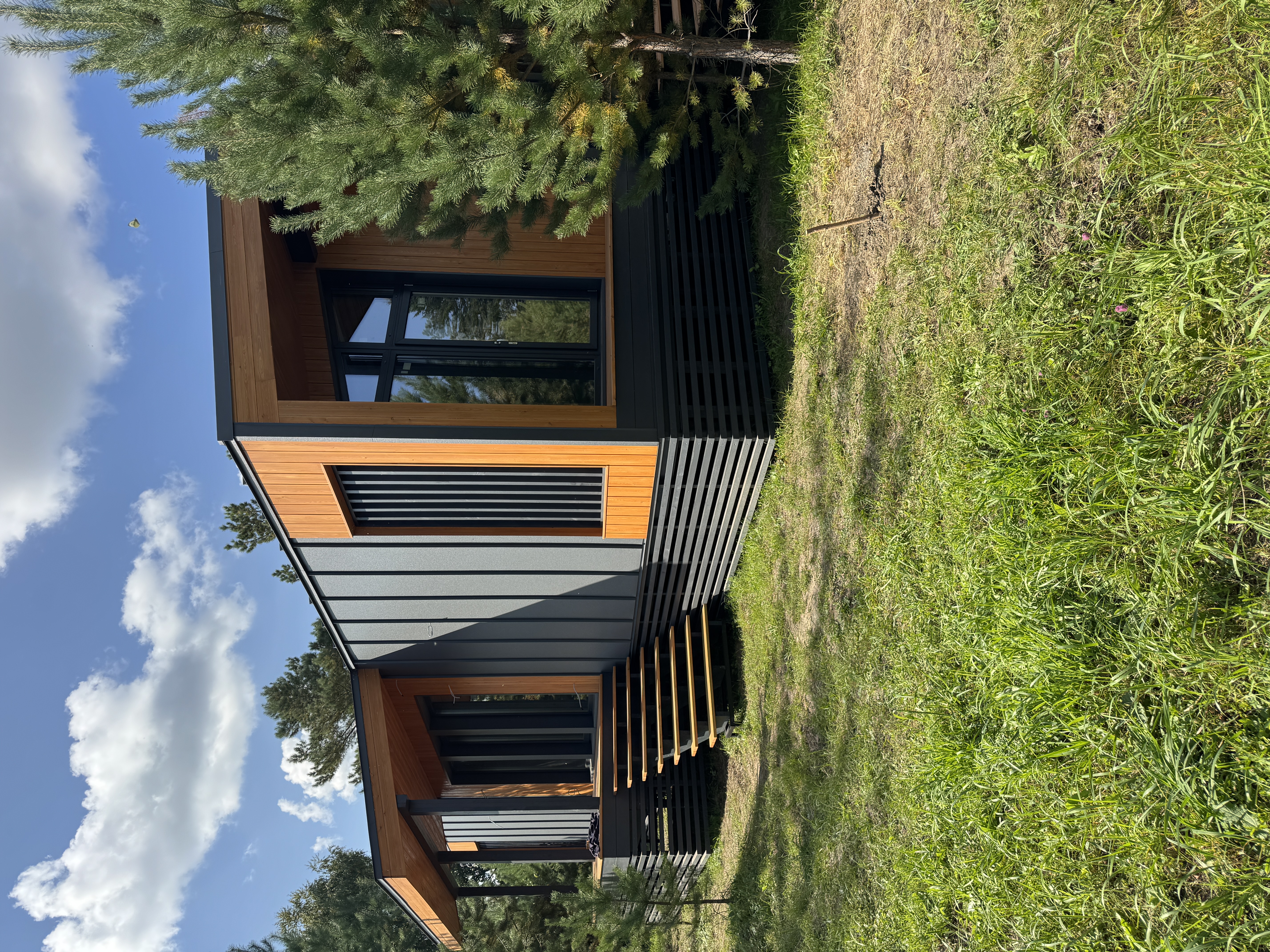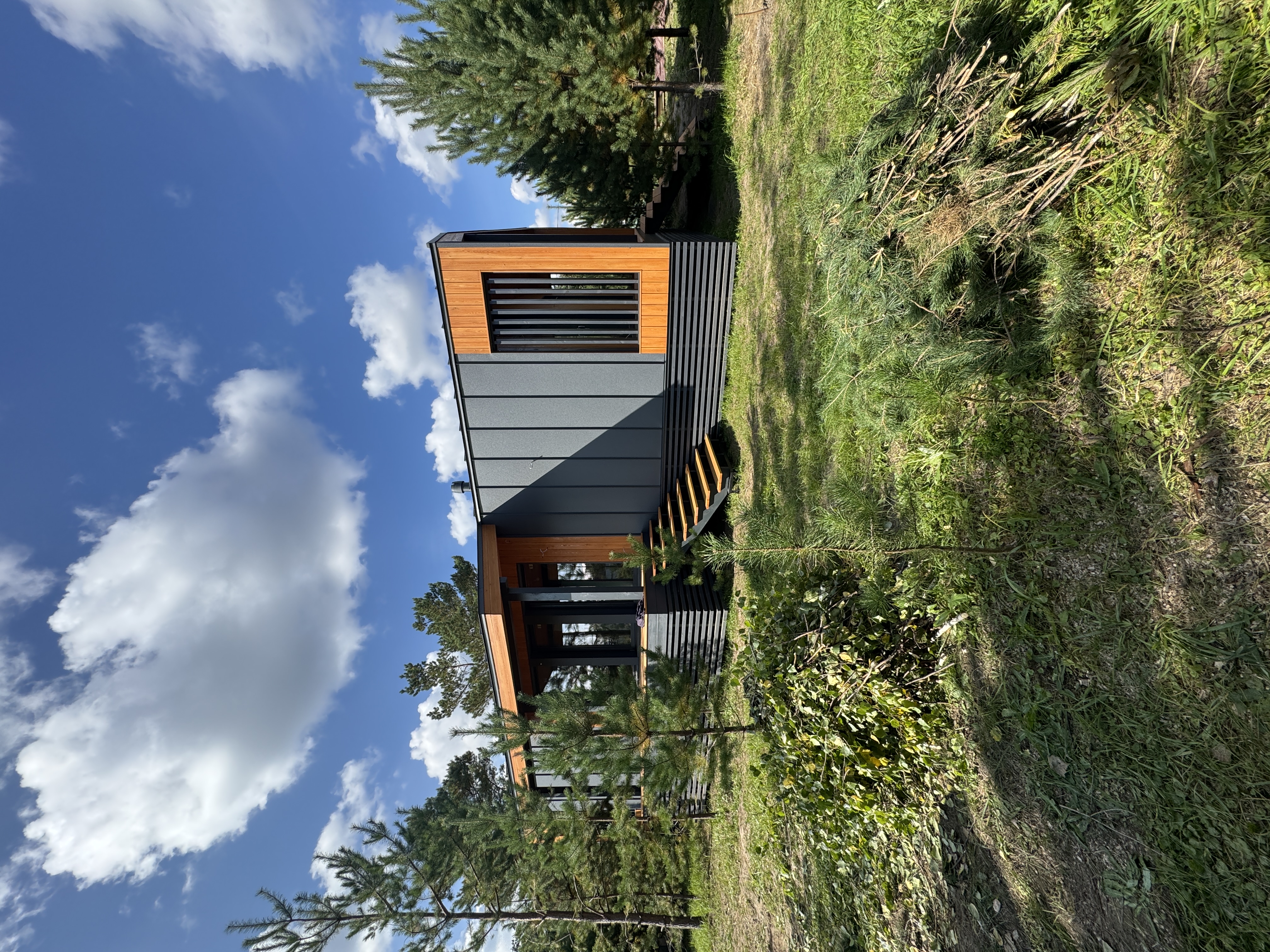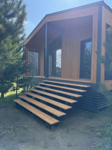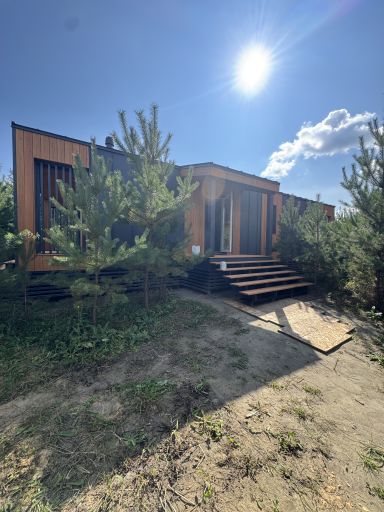 Каркасный дом по нашему типовому проекту находящийся в СНТ "Элеваторщик". Фундамент винтовые сваи. Толщина теплоизоляции стен 200 мм , кровли 300 мм , фасад комбинированный из кликфальца и дерева, кровля фальцевая, внутренняя отделка ГКЛ.