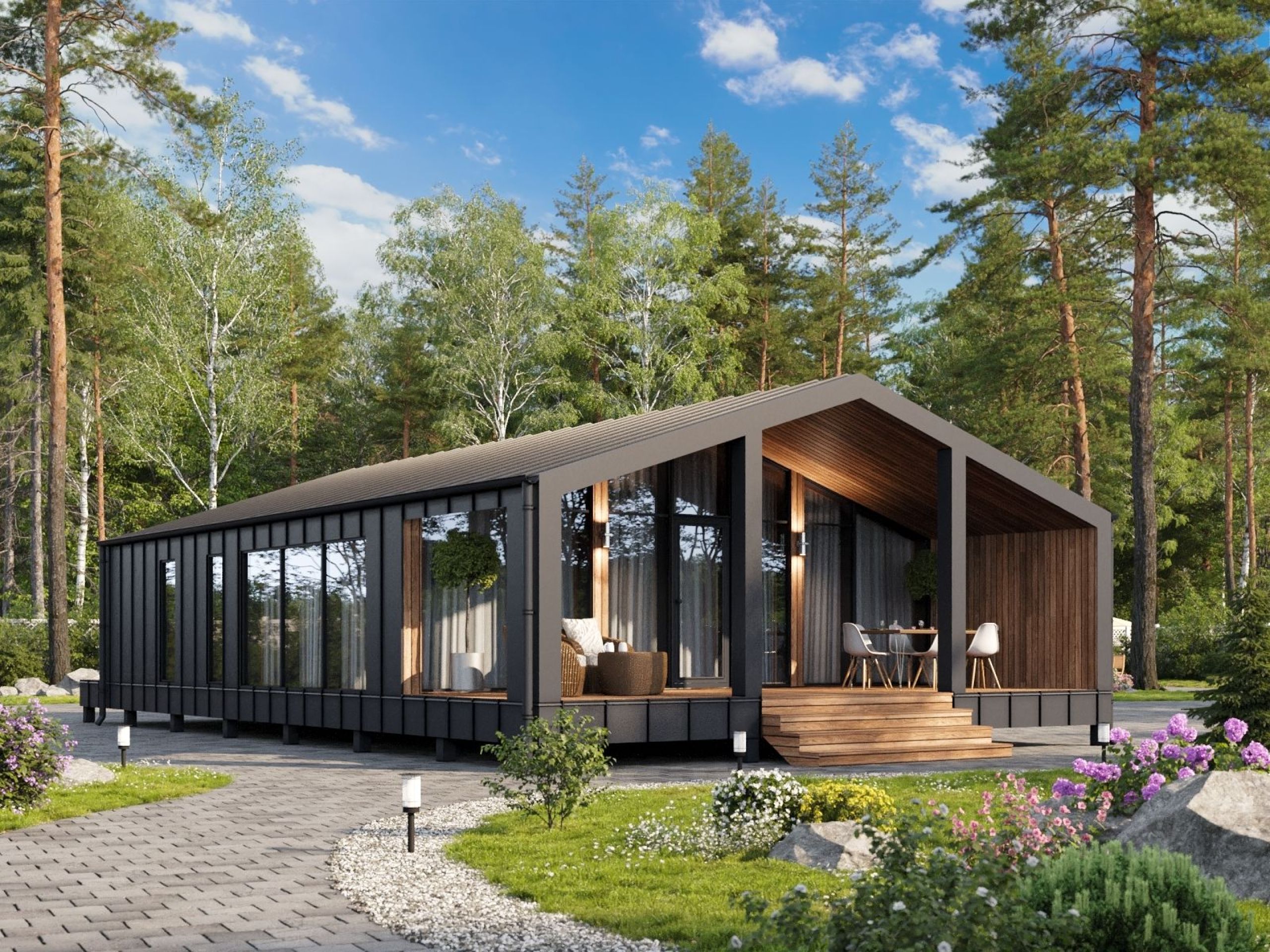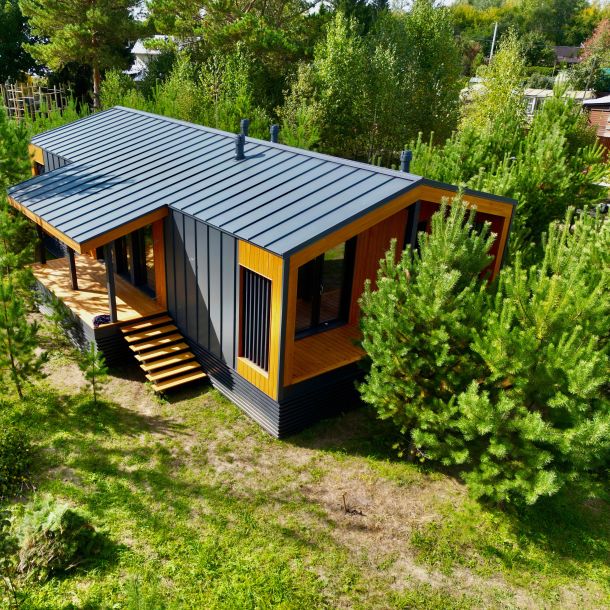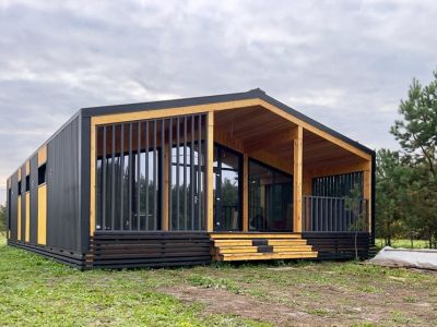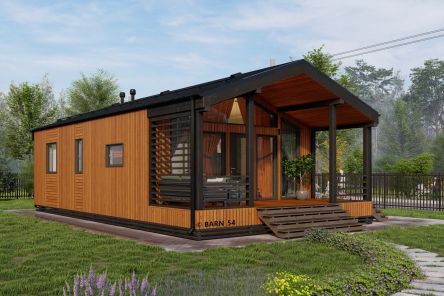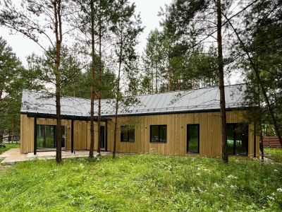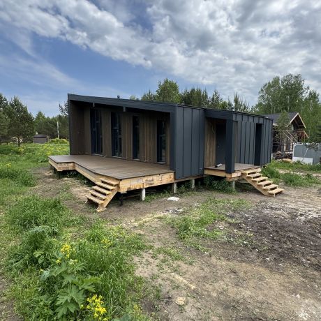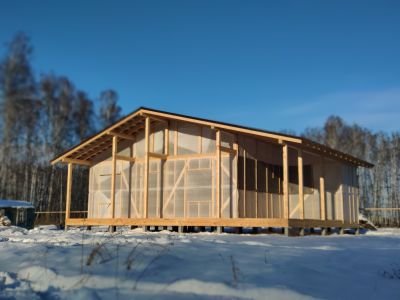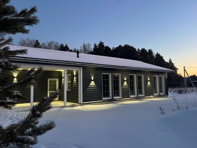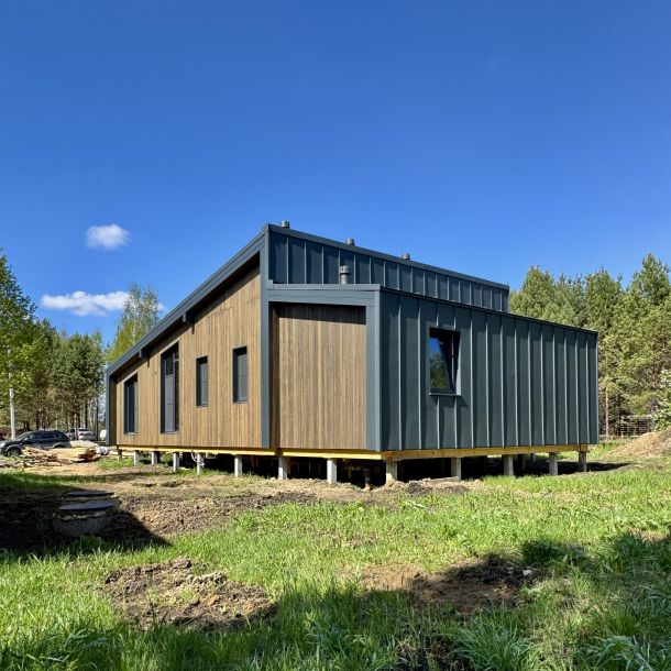 Каркасная дом-баня по нашему типовому проекту находящийся в п. Кирово. Фундамент винтовые сваи. Толщина теплоизоляции стен 150 мм , кровли 200 мм , фасад комбинированный из кликфальца и дерева, кровля фальцевая, внутренняя отделка ГКЛ/вагонка штиль.