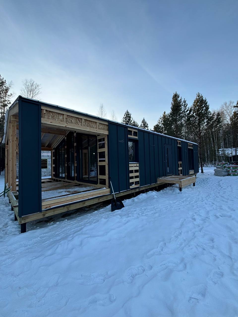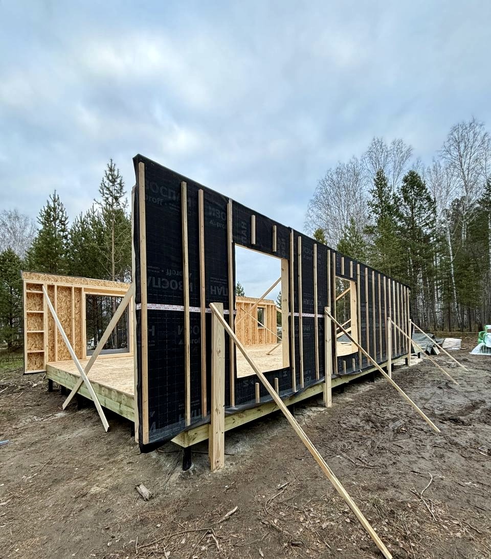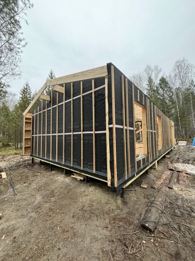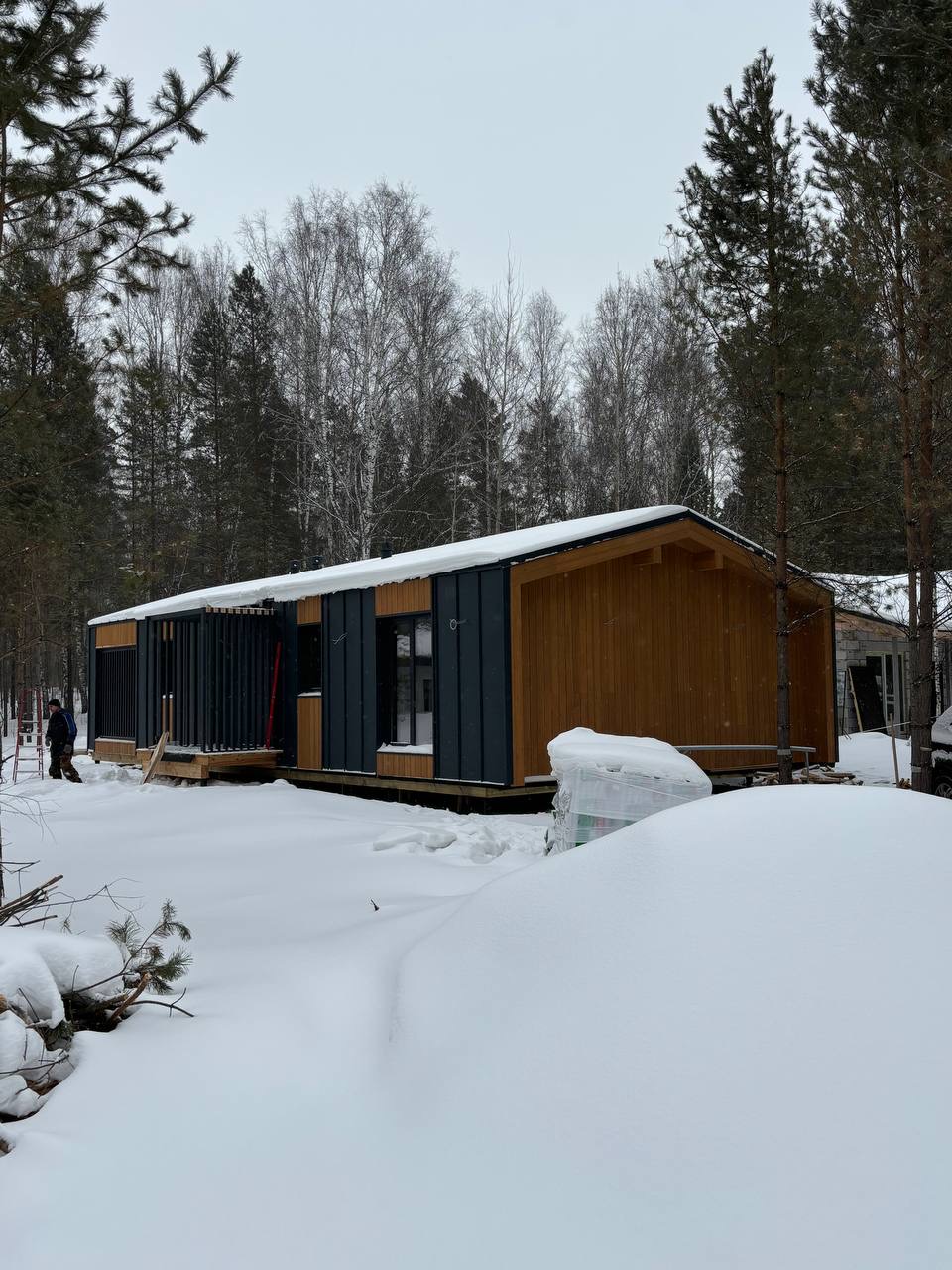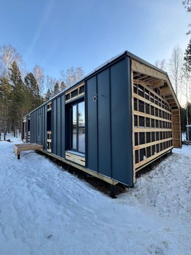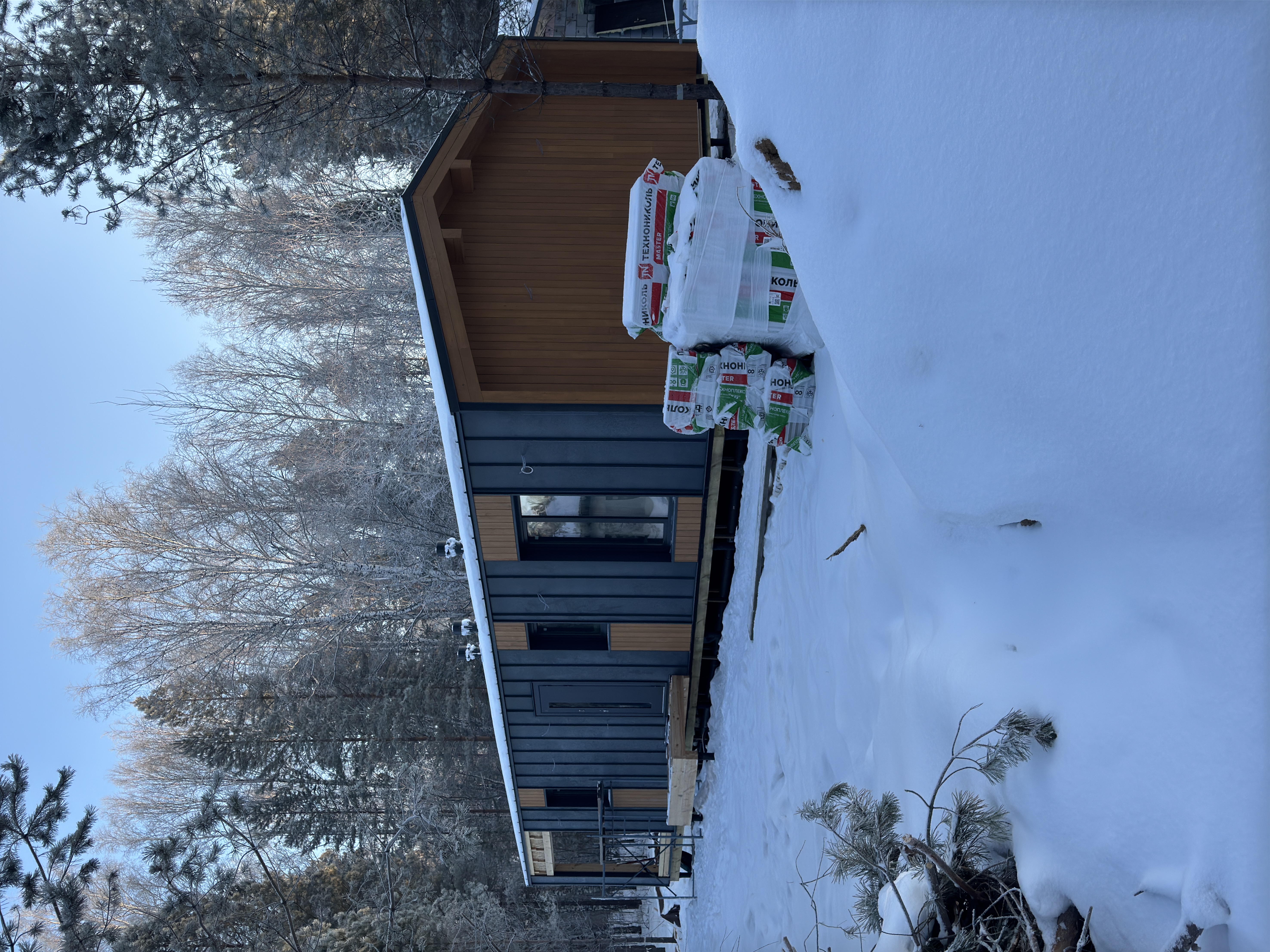 Каркасный дом по нашему типовому проекту находящийся в п. Степной, мрн. Калиновый. Фундамент винтовые сваи. Толщина теплоизоляции стен 200 мм , кровли 300 мм , фасад комбинированный из кликфальца и дерева, кровля фальцовая, внутренняя отделка ГКЛ/вагонка штиль.