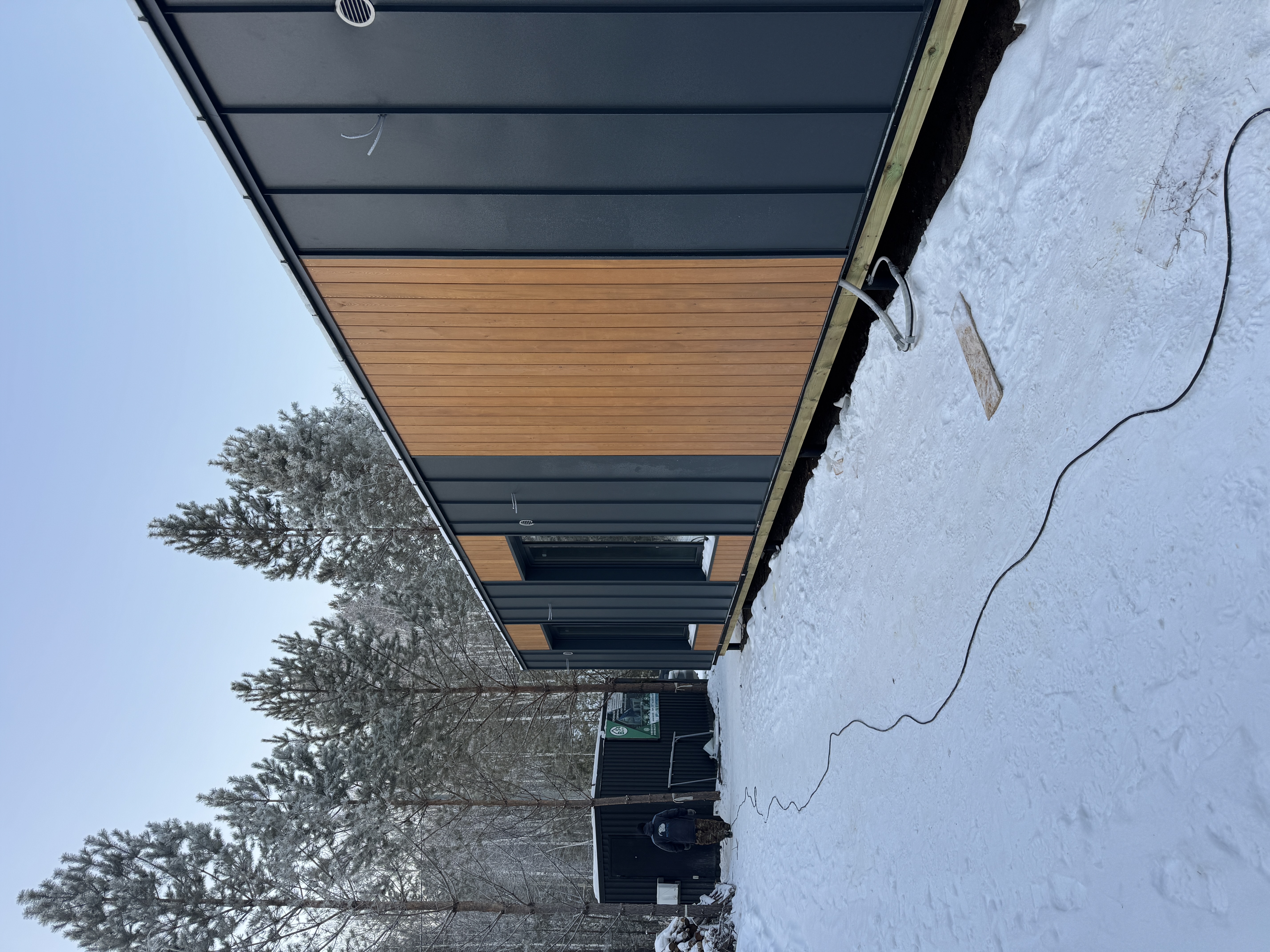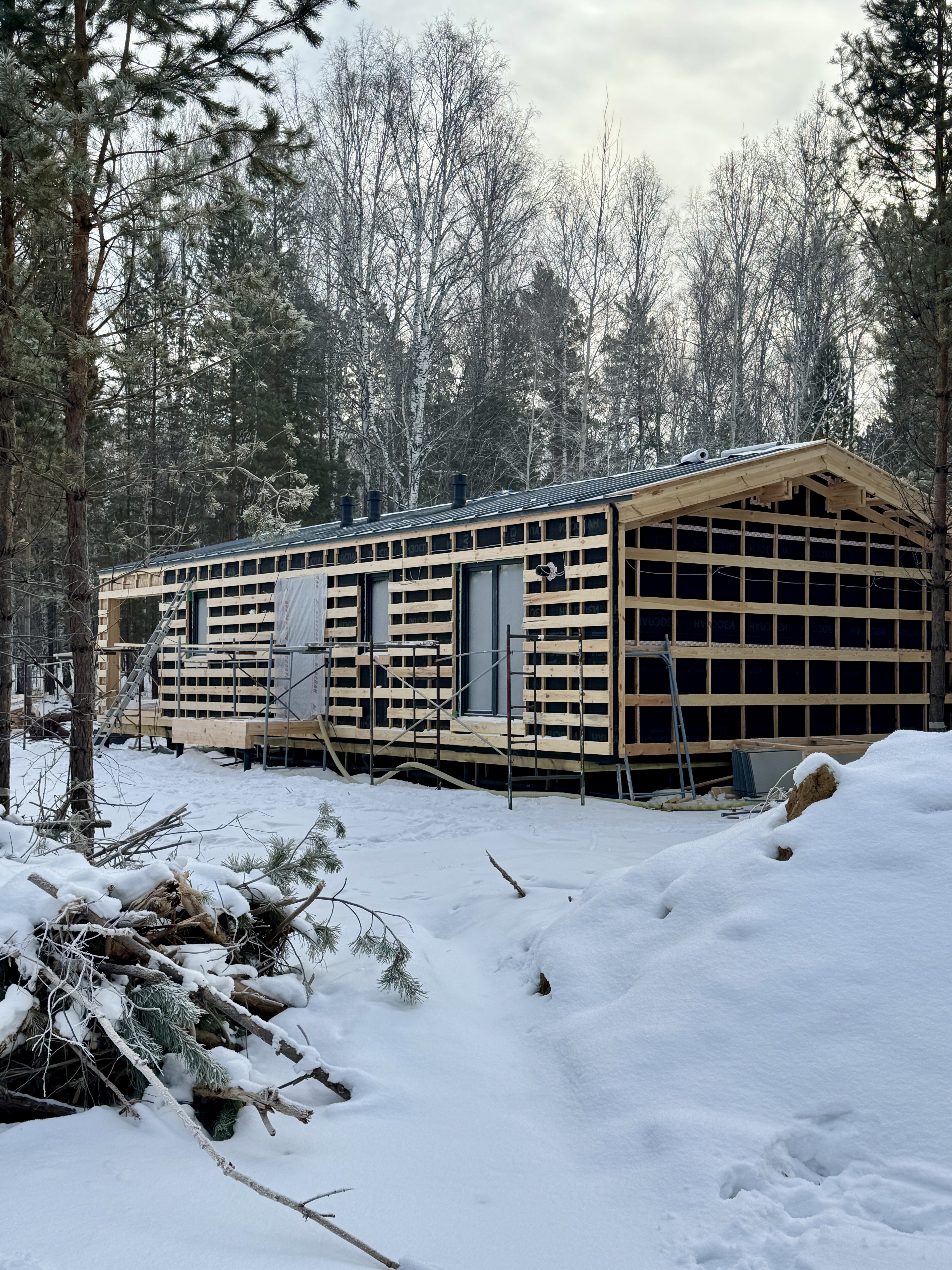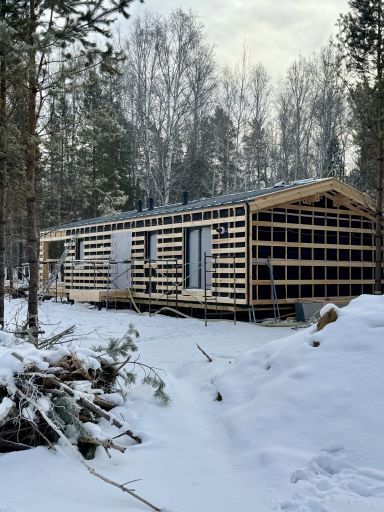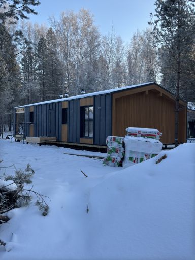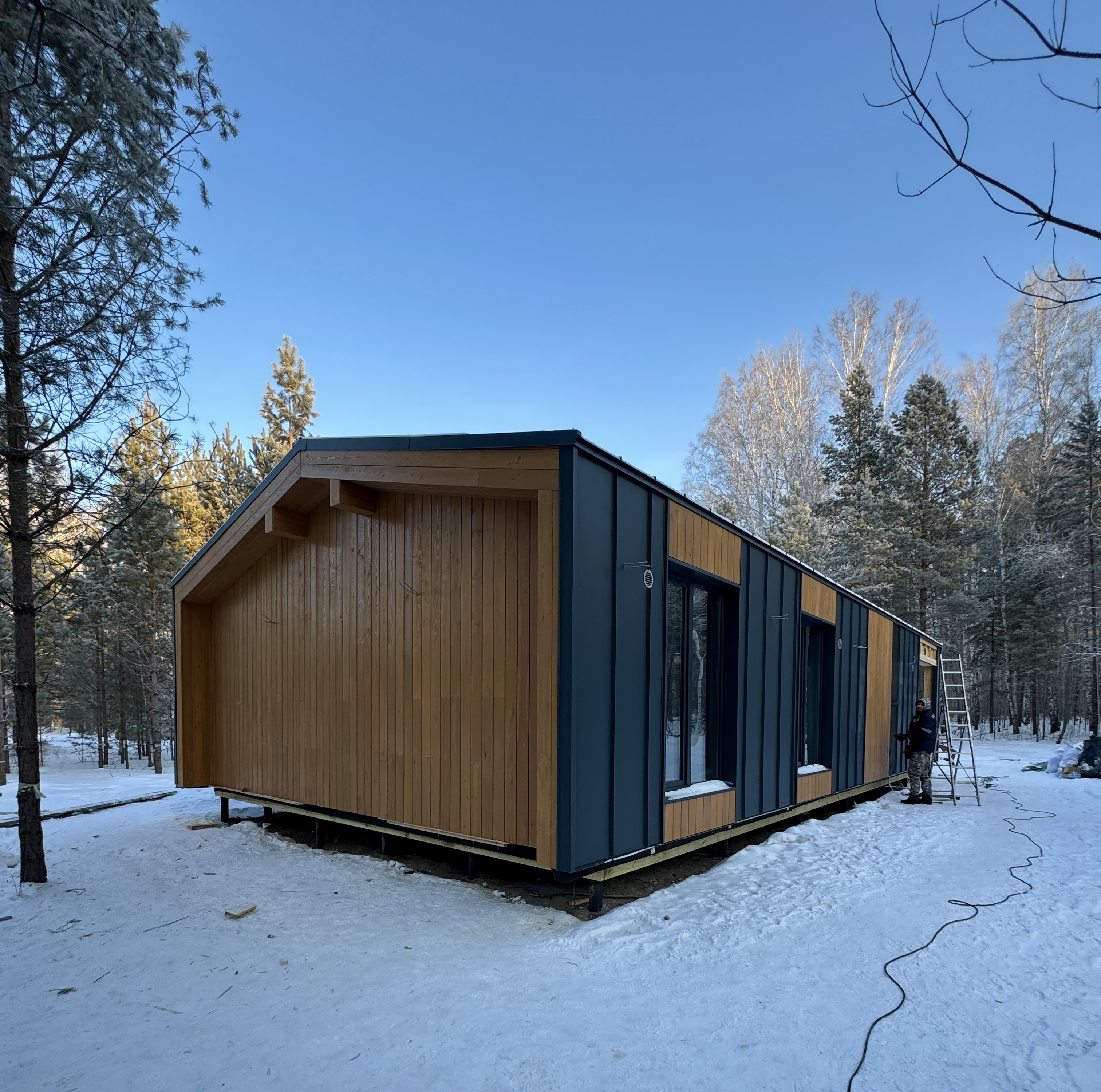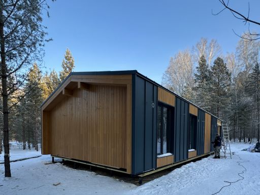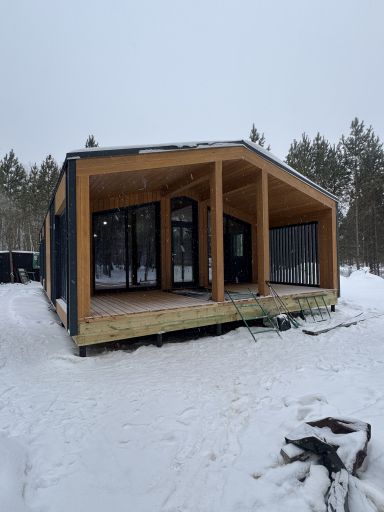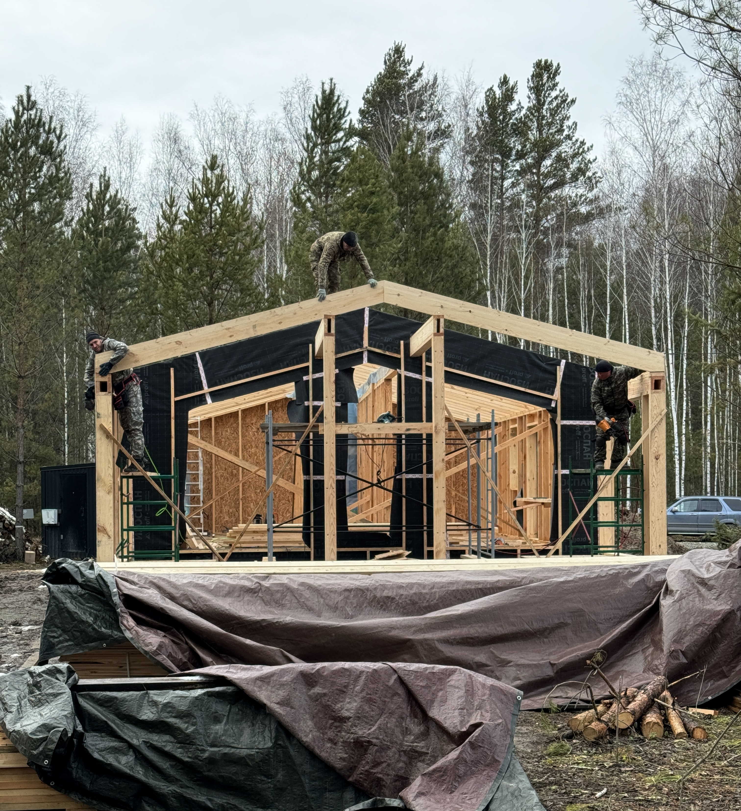Каркасный дом по нашему типовому проекту находящийся в п. Степной, мрн. Калиновый. Фундамент винтовые сваи. Толщина теплоизоляции стен 200 мм , кровли 300 мм , фасад комбинированный из кликфальца и дерева, кровля фальцовая, внутренняя отделка ГКЛ/вагонка штиль.