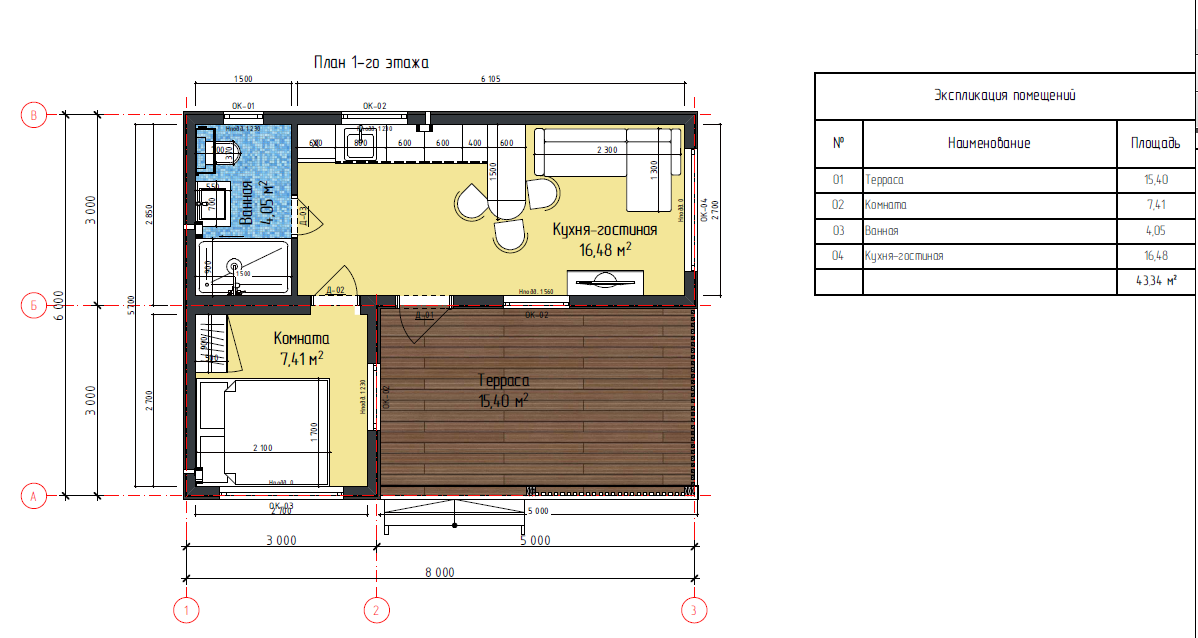 → Внутренняя отделка: стены и потолок вагонка "штиль" сорта АБ с покраской (цвет на выбор), полы черновые — OSB-3 в сухих помещениях, санузлах и влажных помещениях ЦСП